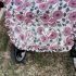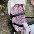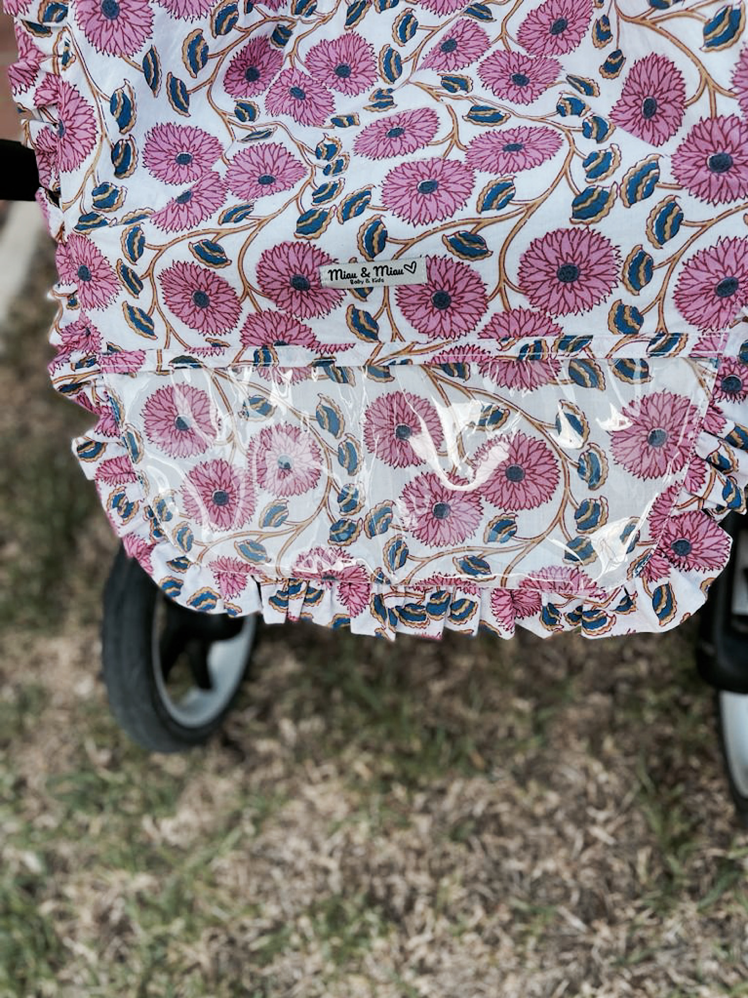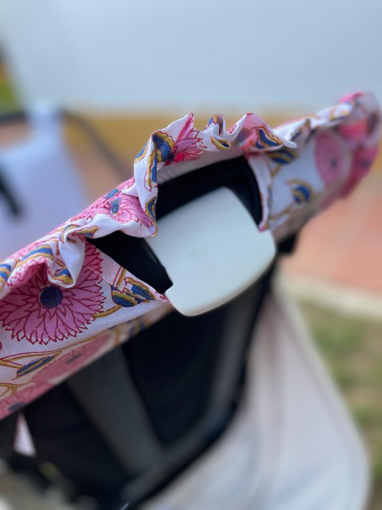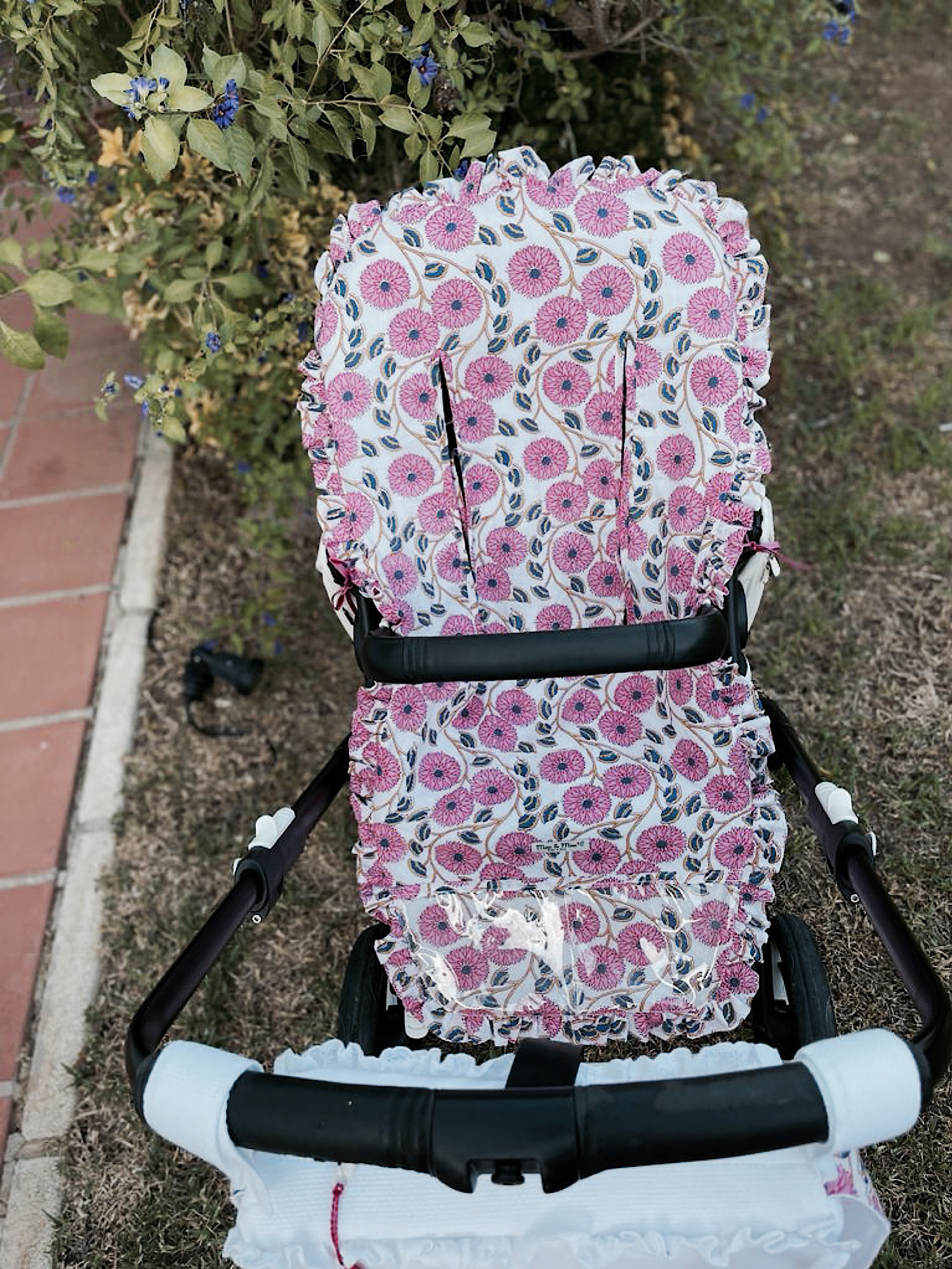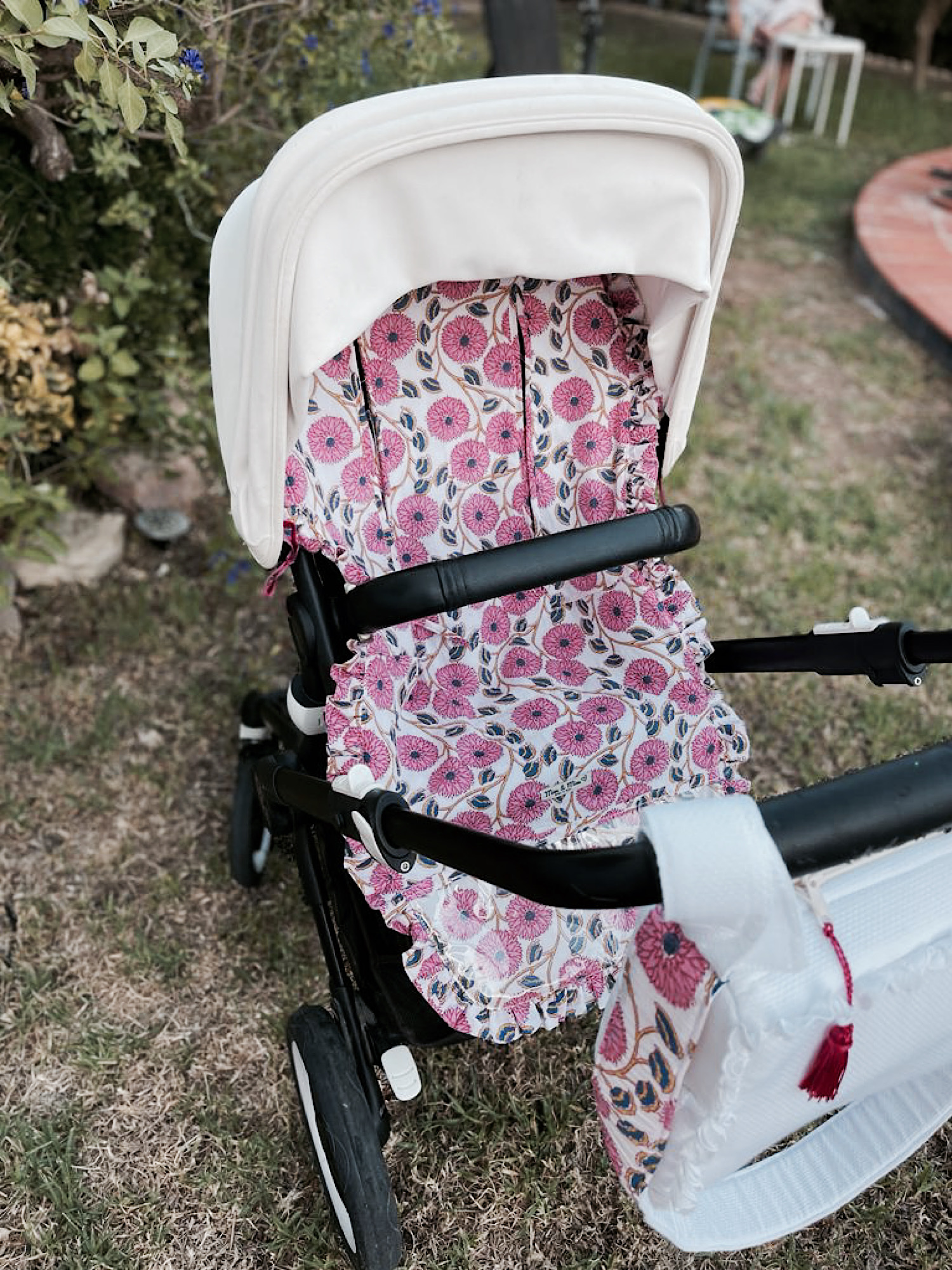 Combina la funda de carro con nuestra bolsa de piqué y asa flor rosa