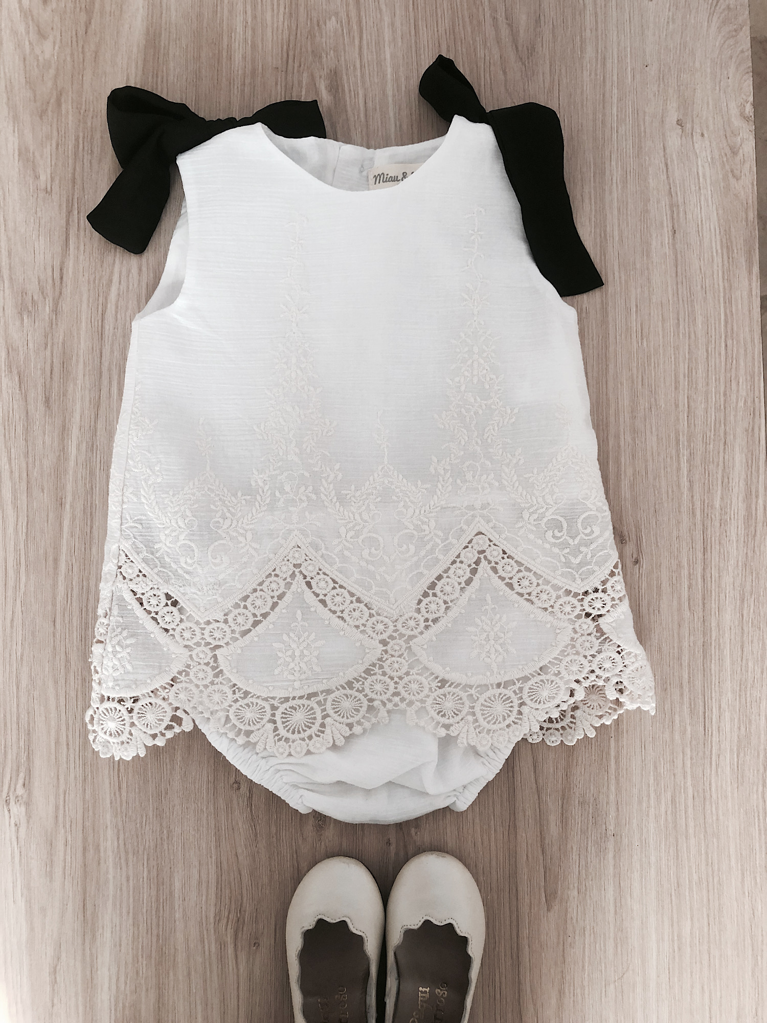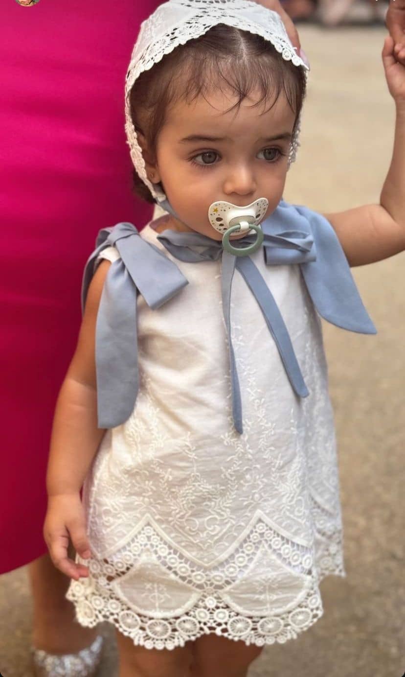 Jesusito de algodón 100% acabado en puntas bordadas, con dos lazadas en hombros en seda negra, va forrada y abotonada por la espalda, lleva su braguita a juego. Sin duda un conjunto precioso y elegante.Lleva braguitas hasta 36 meses. A partir de la 4 años se considera vestido.