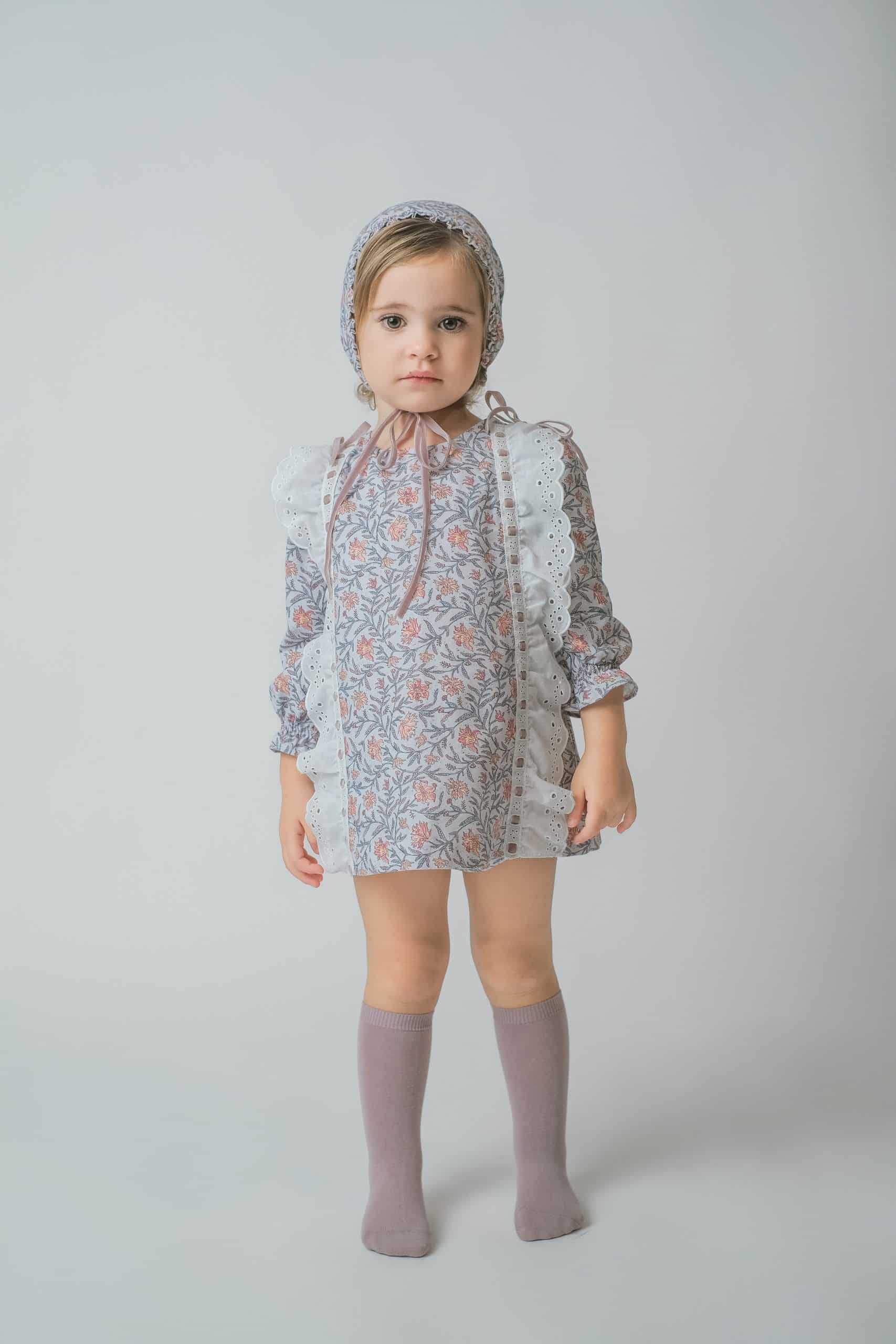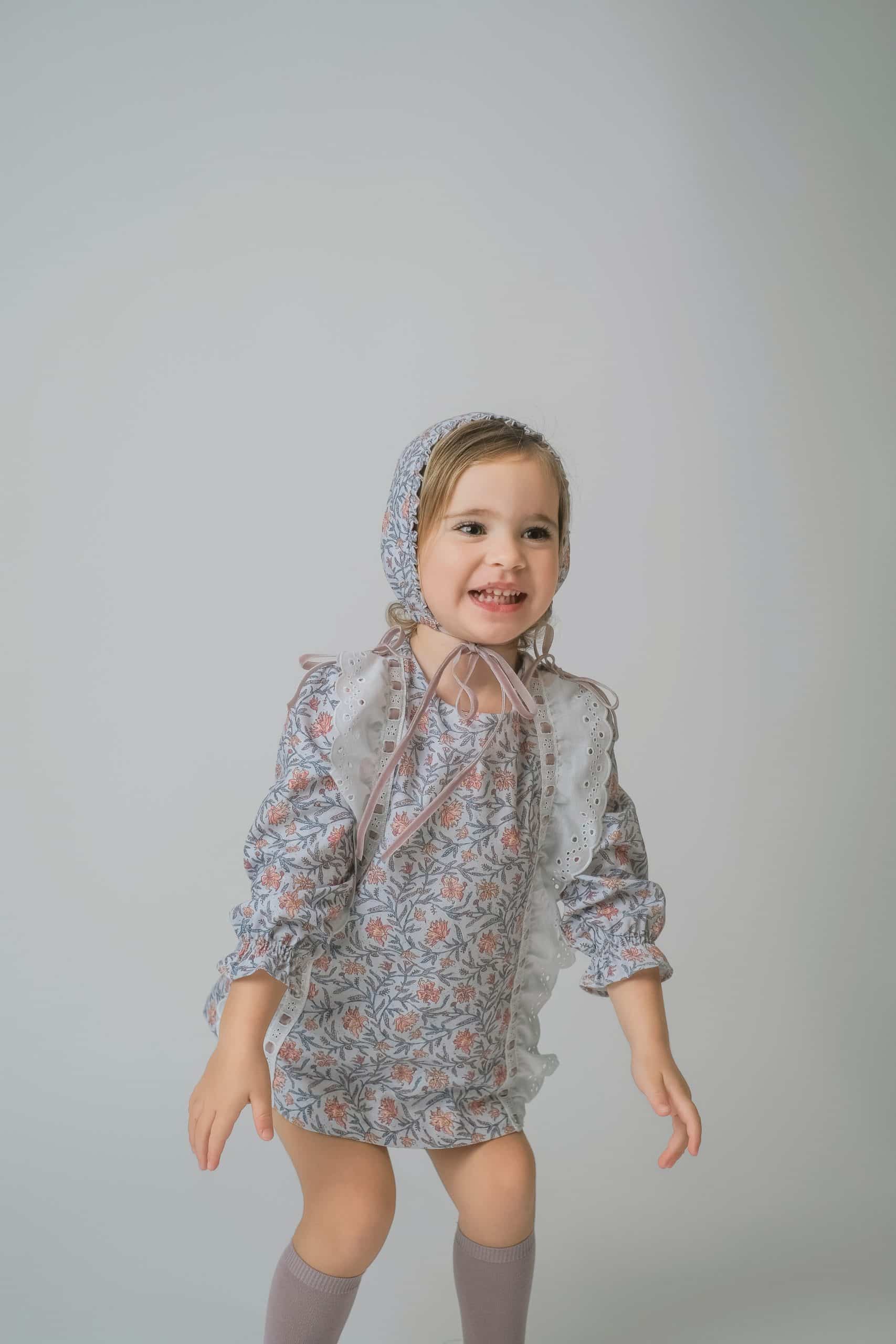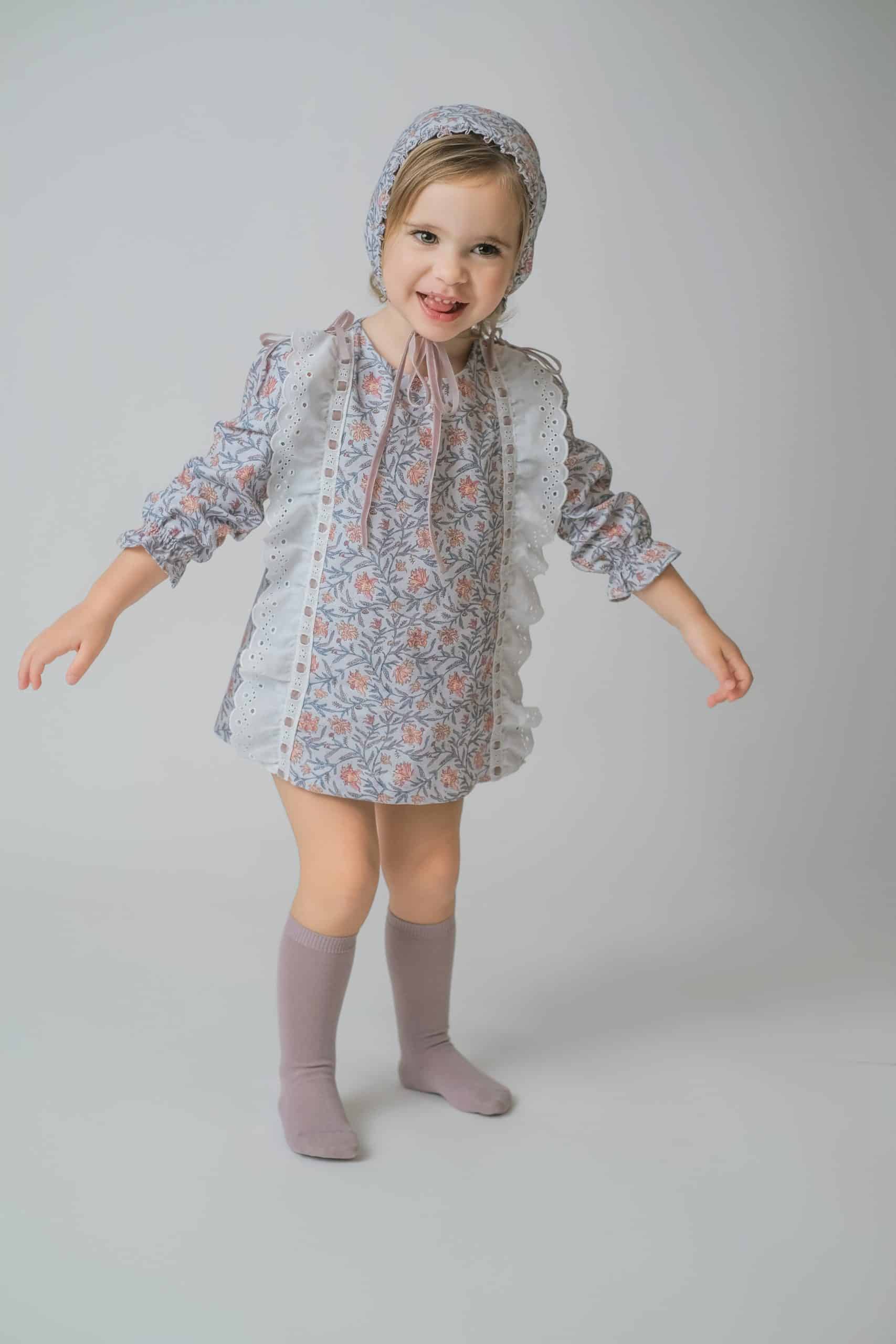Jesusito Fabiola con un precioso estampado floral tonos celestes rosas, coral y malvas, combinado con tira bordada y pasa cinta en malva de terciopelo. Totalmente forrado, 100% algodón. Incluye braguita. Talla a la edad.