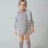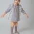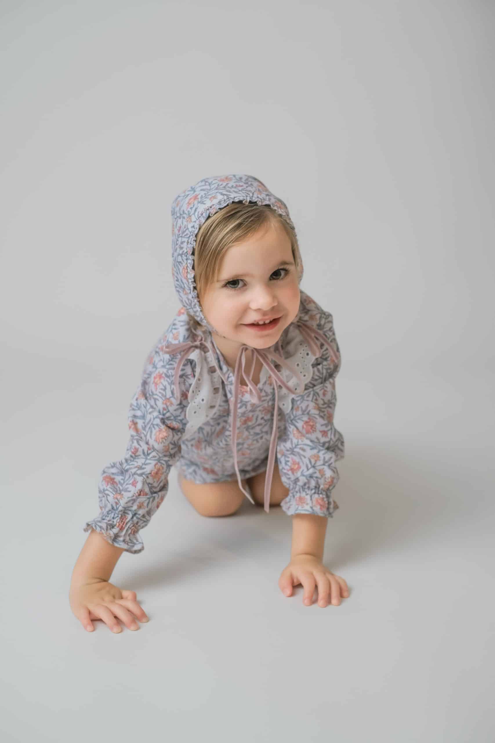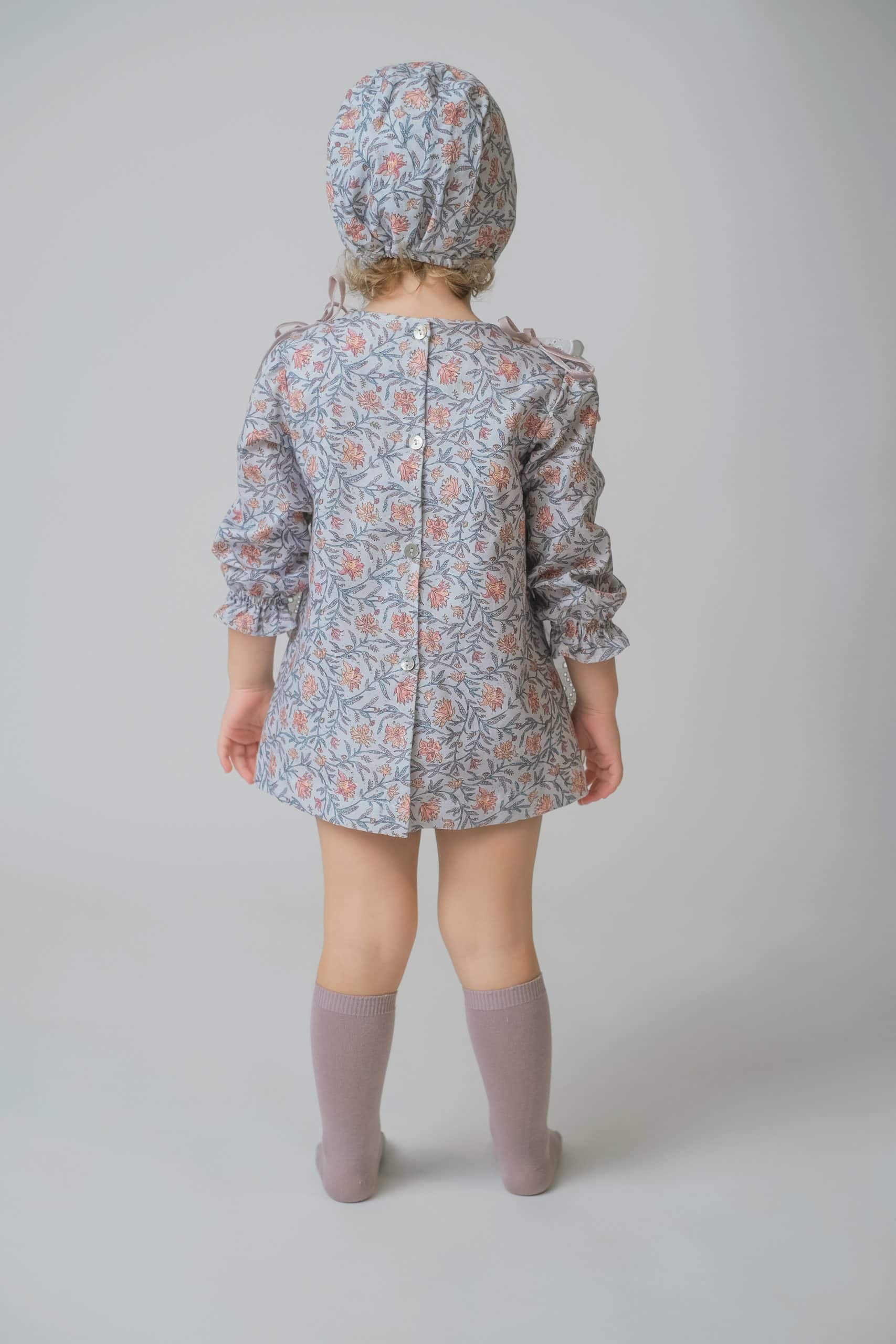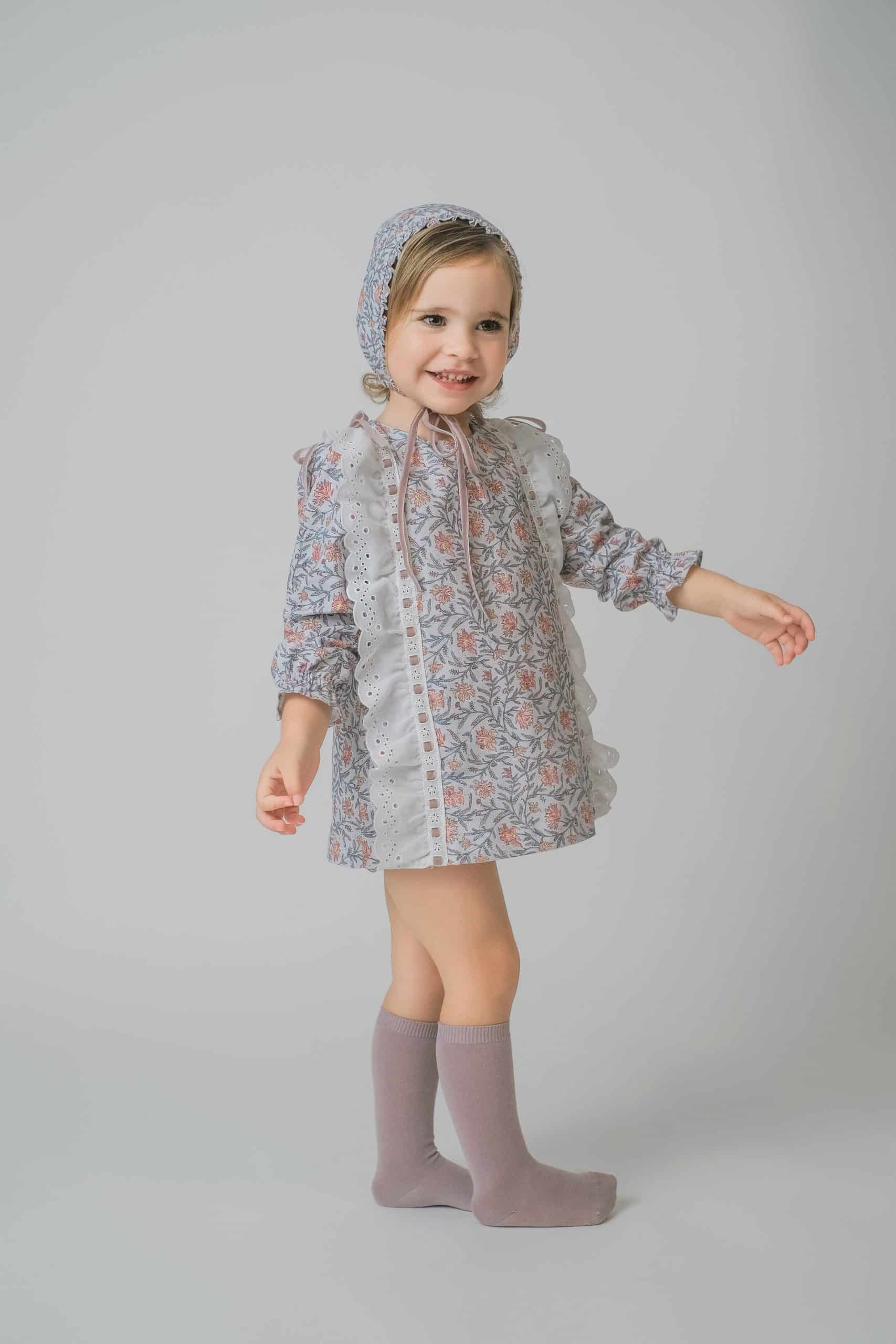 Jesusito Fabiola con un precioso estampado floral tonos celestes rosas, coral y malvas, combinado con tira bordada y pasa cinta en malva de terciopelo. Totalmente forrado, 100% algodón. Incluye braguita. Talla a la edad.