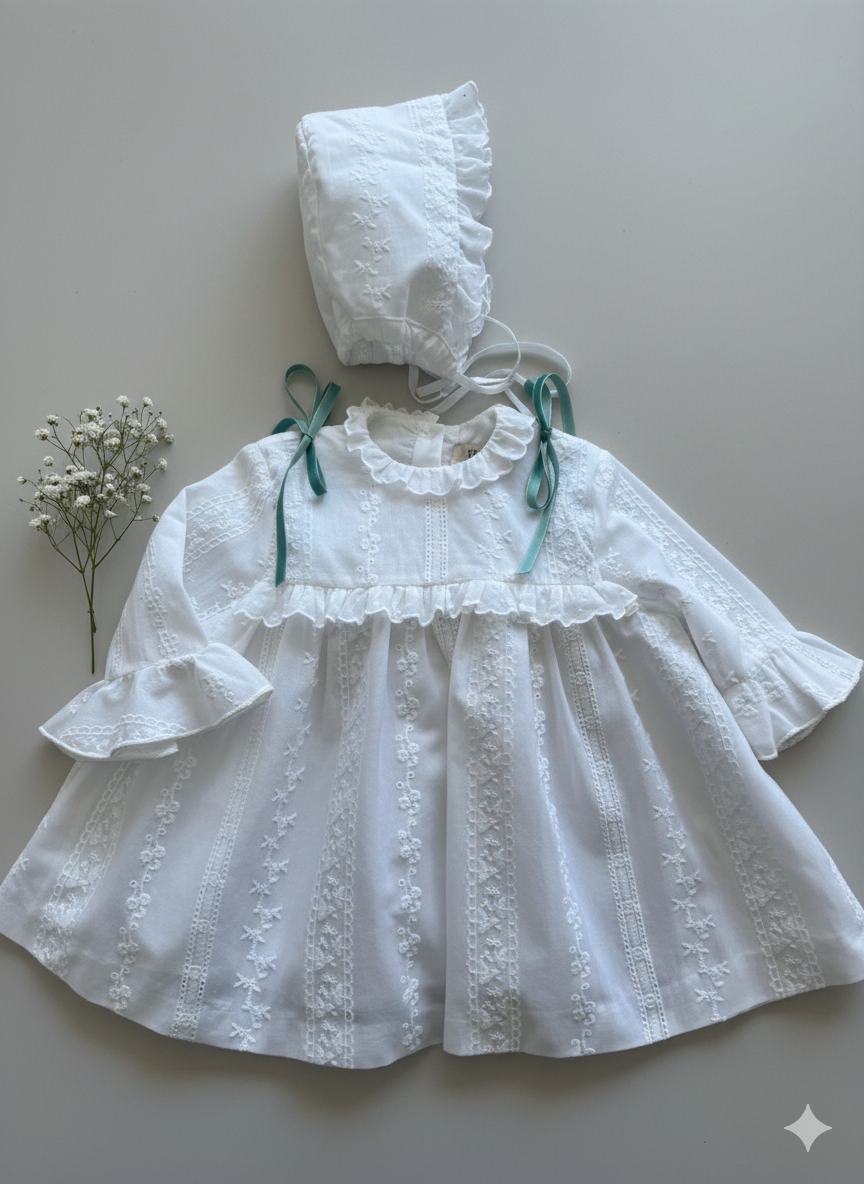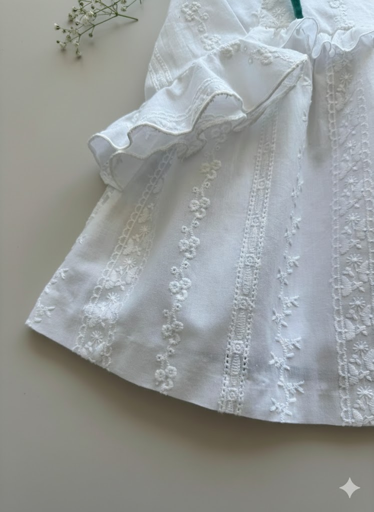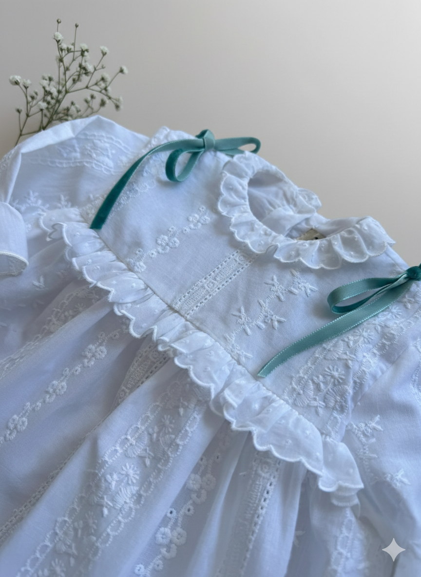 Jesusito forrado con un tejido espectacular de flores en blanco, 100% algodón con manga media, hasta talla 3 años incluye la braguita. Tallan a la edad