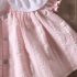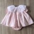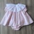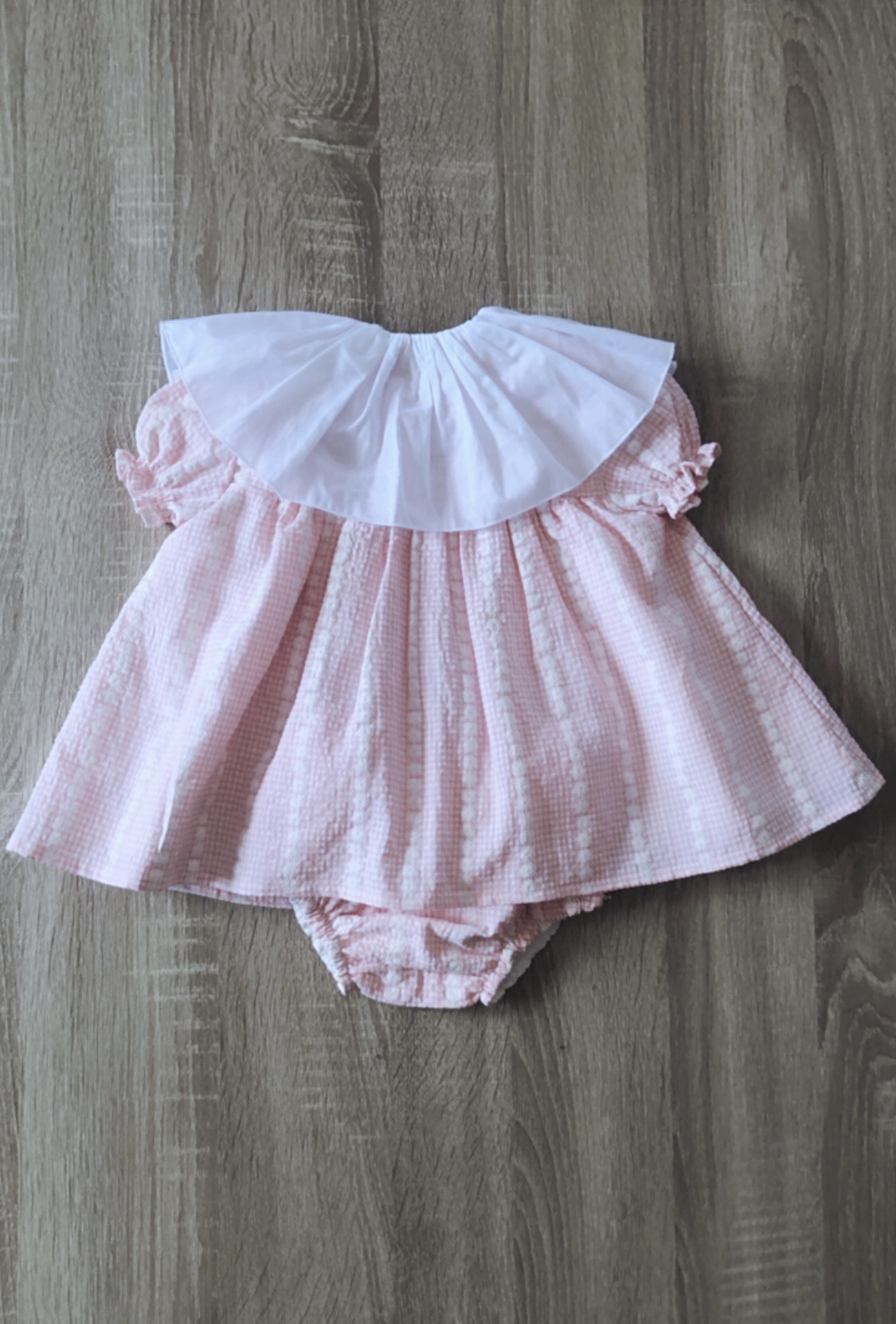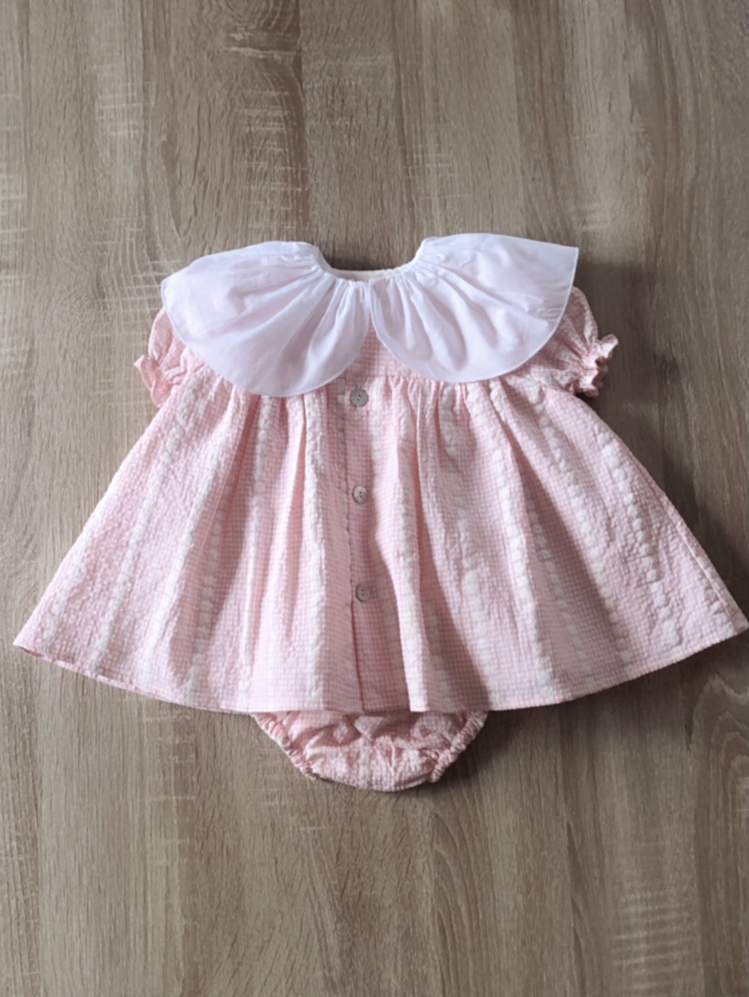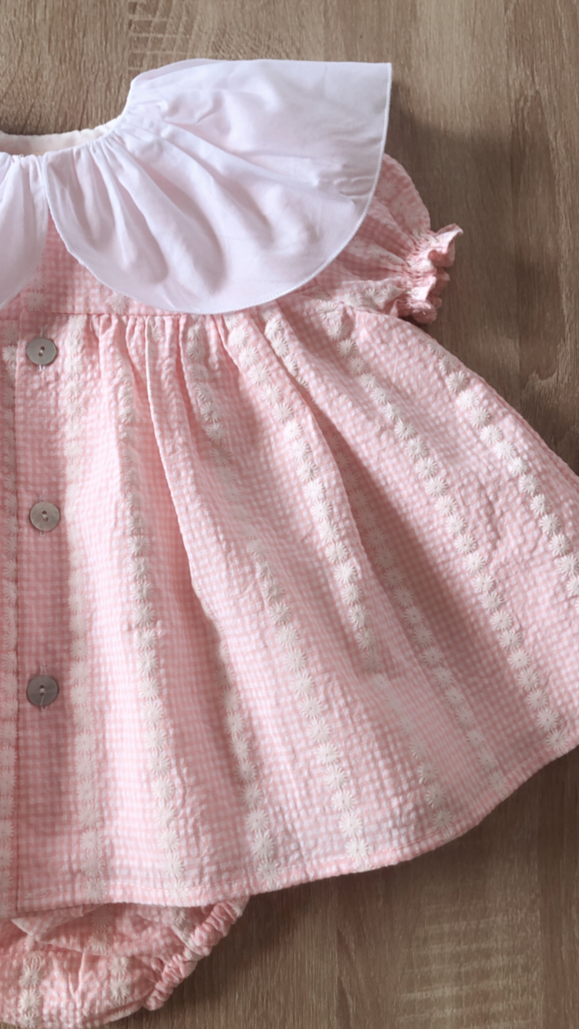 Jesusito de algodón con braguitas a juego, estampado vichy rosa salmón con margaritas blancas y un bonito cuello liso. Tallan bien.