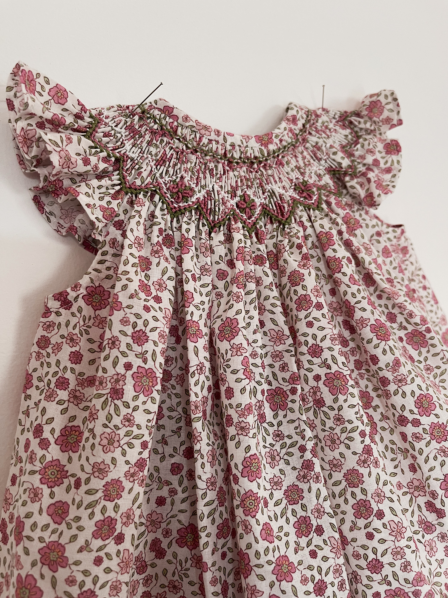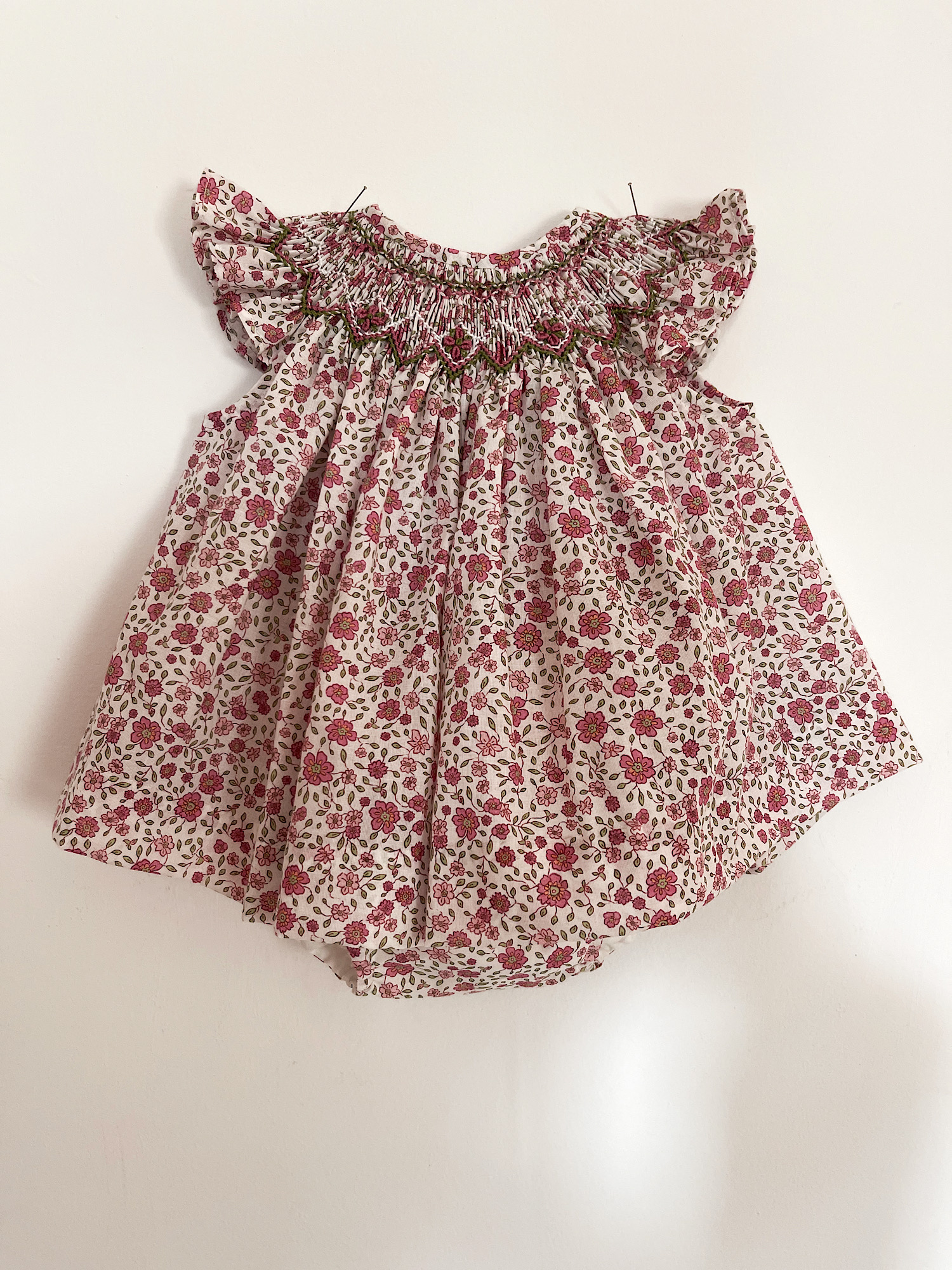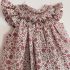Preciosa batista de flores en tonos rosas bordada a mano y mangas en forma de alas. Tallan a la edad.