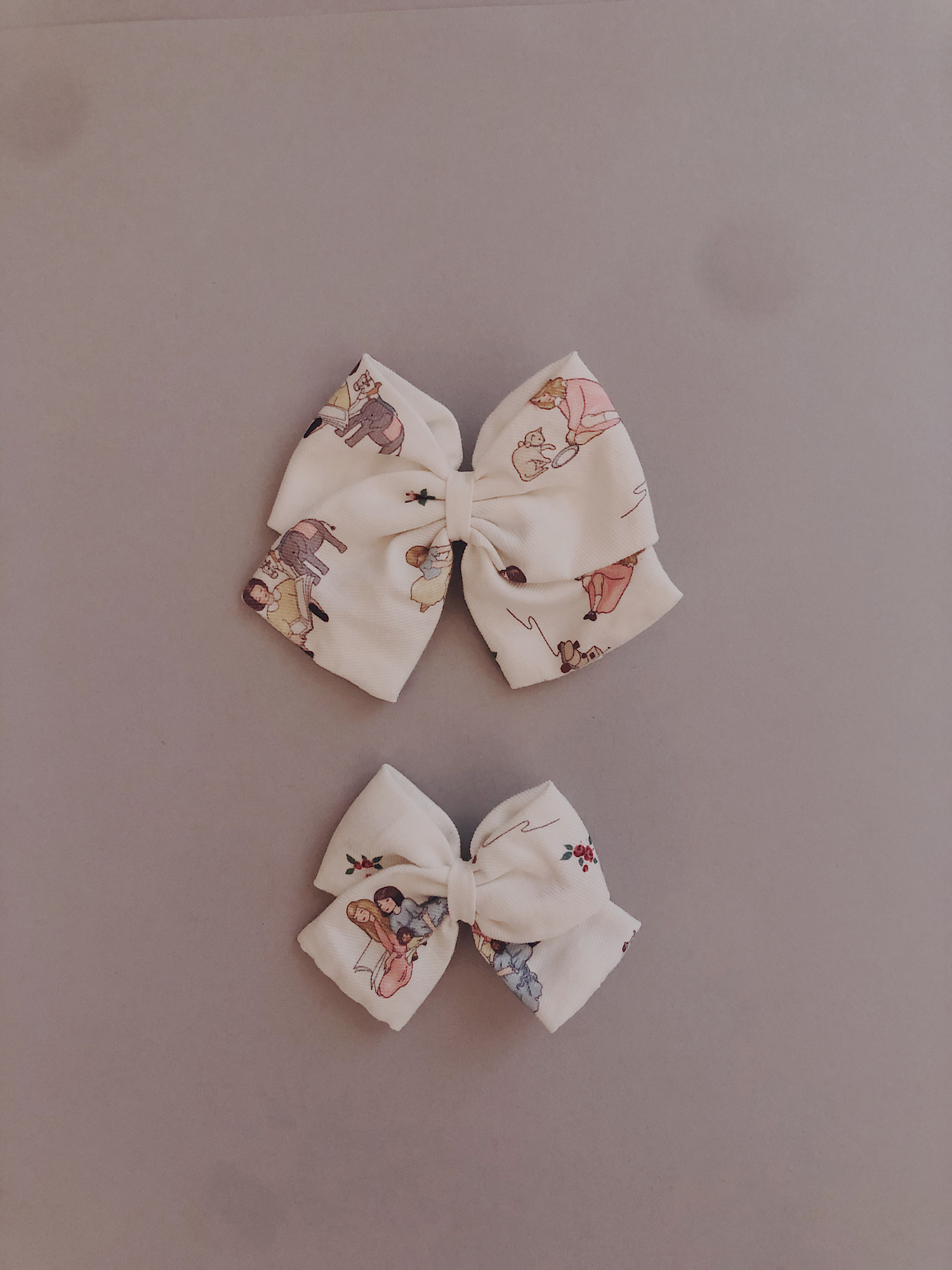 Lazo pequeño 7cm de alto y 8cm de ancho aproximadamente y lazo grande 11cm de ancho y  9cm de alto aproximadamente, van con pinza de agarre.