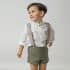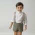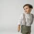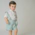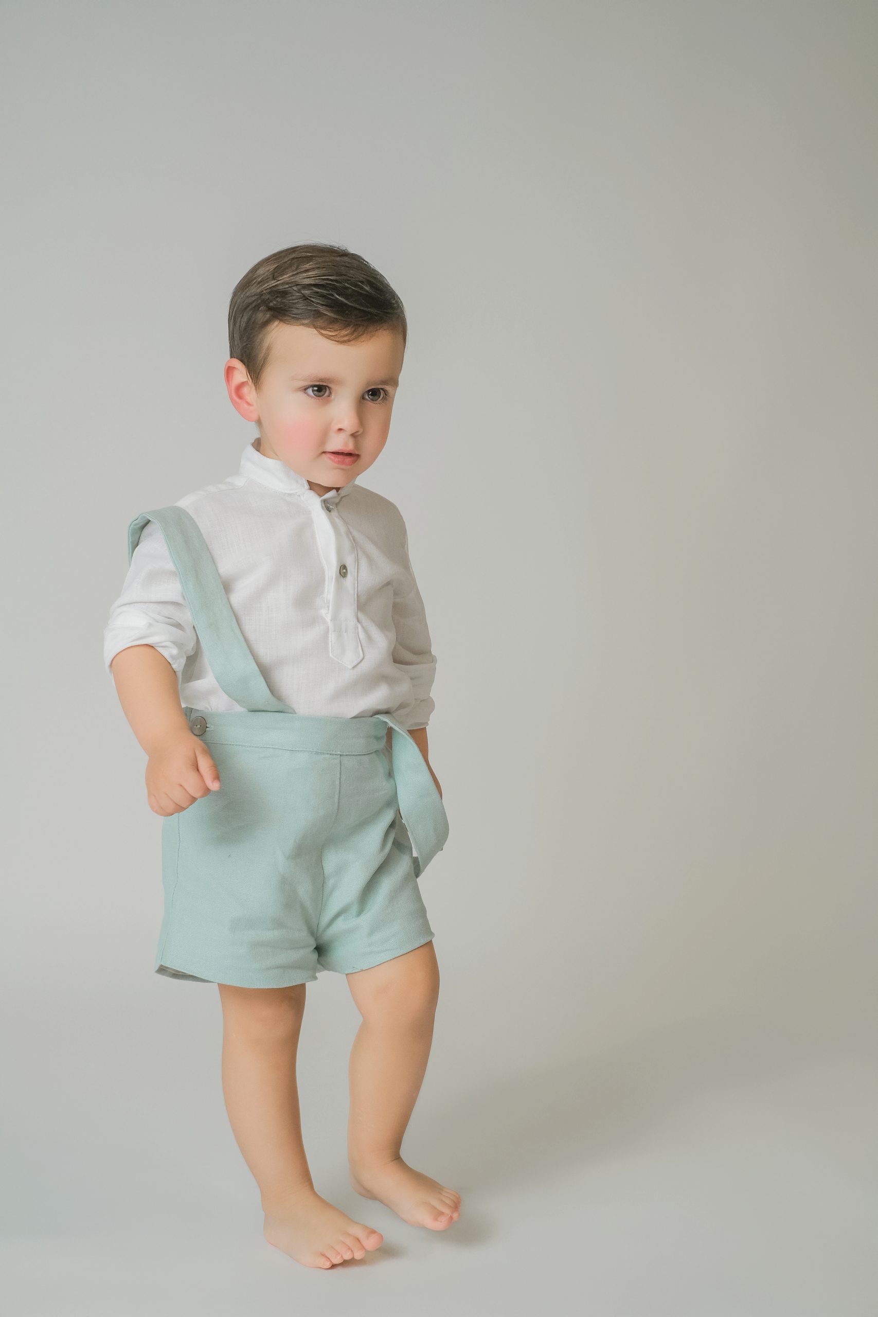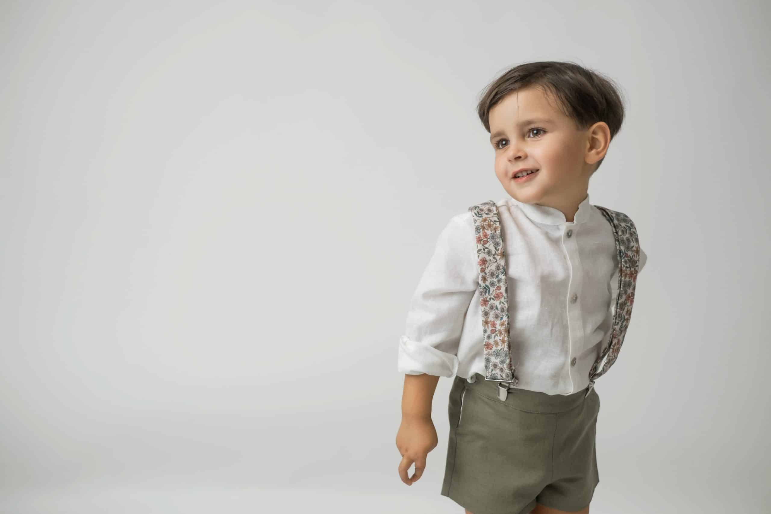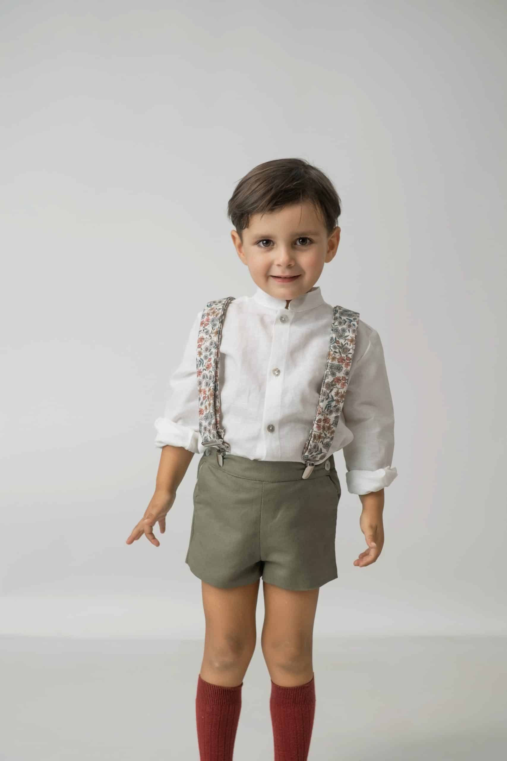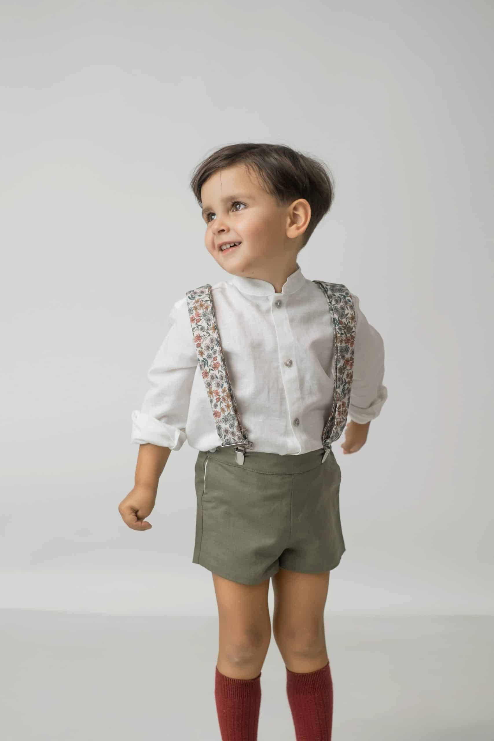 Pantalón de Lino con tirantes, van abotonados y cruzados por la espalda. Dentro de la cinturilla lleva un elástico con botones y ojales a cada lado para ajustar a la medida del niño.