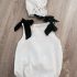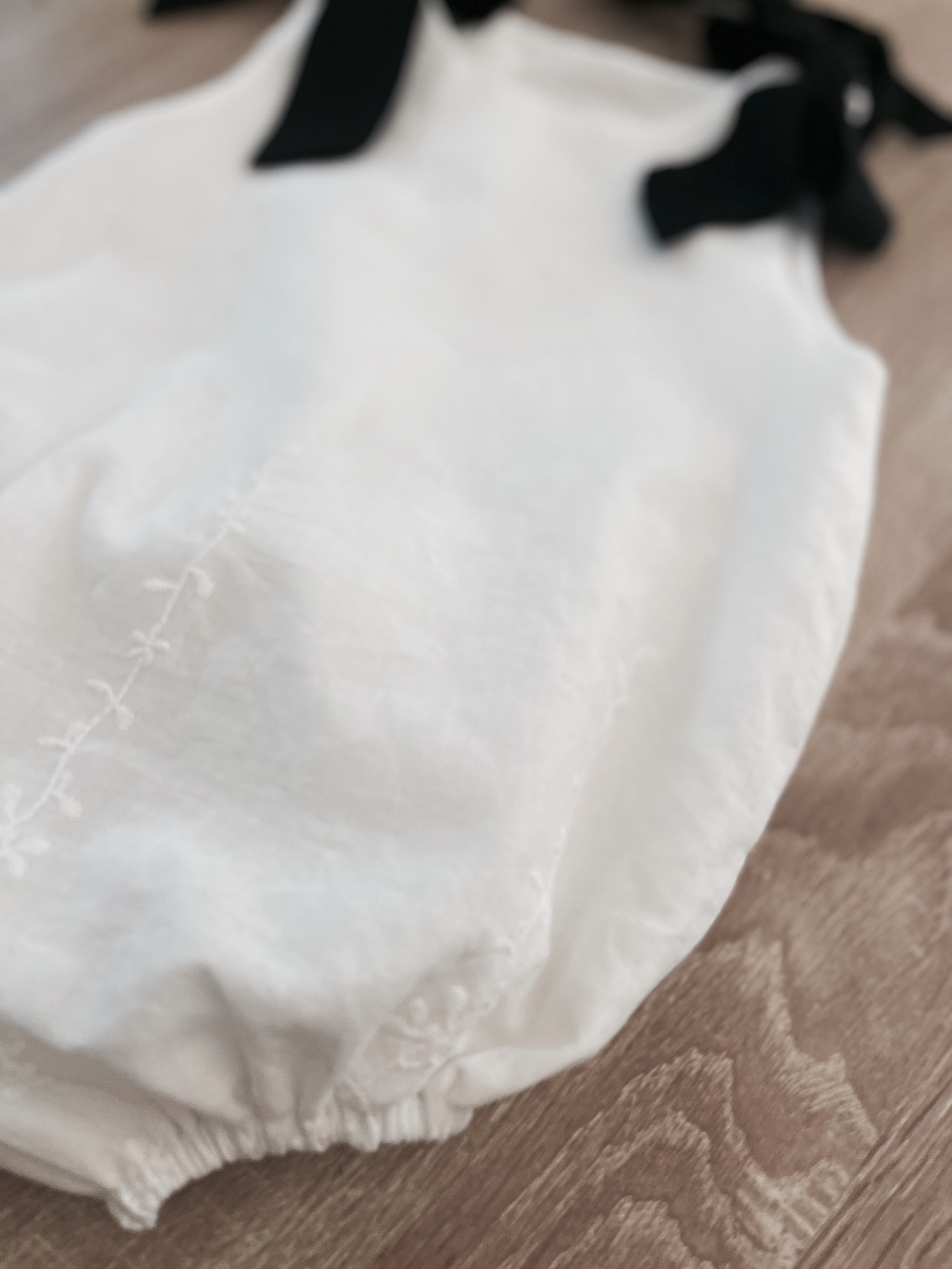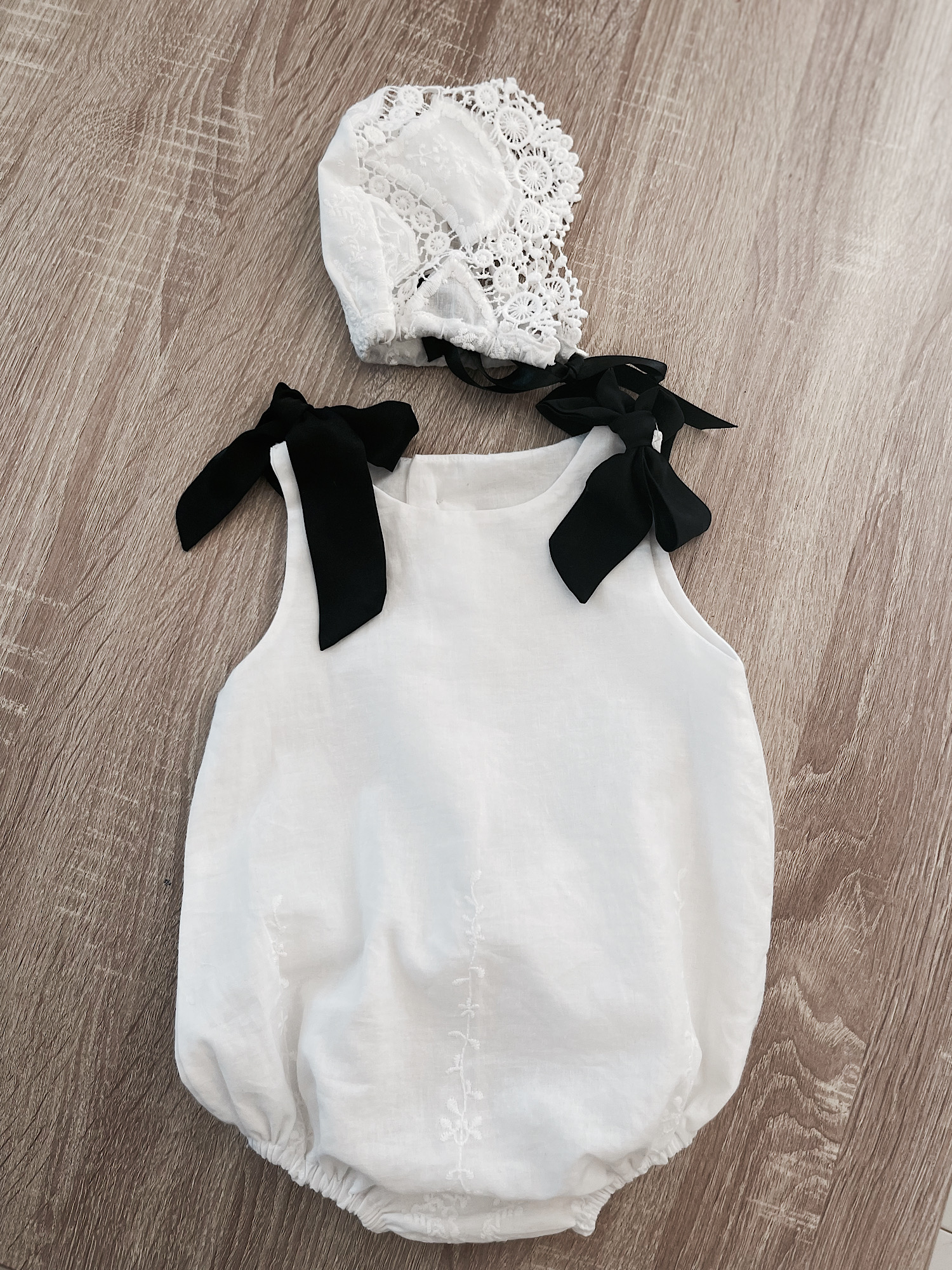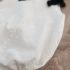 Pelele de algodón 100% en blanco abotonado a media espalda y lleva botones para facilitar el cambio de pañal. Lleva dos lazadas en los hombros. Es totalmente unisex.