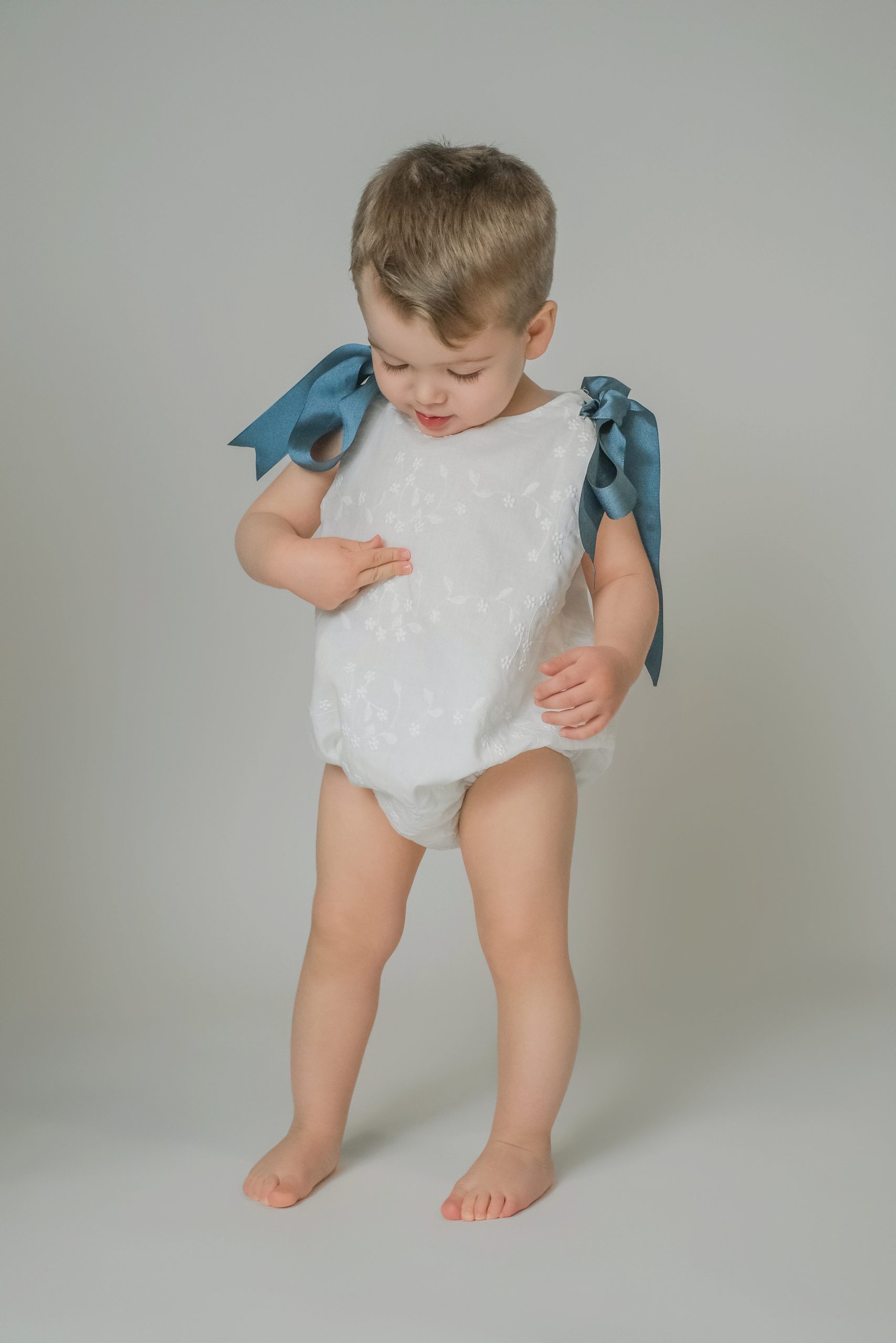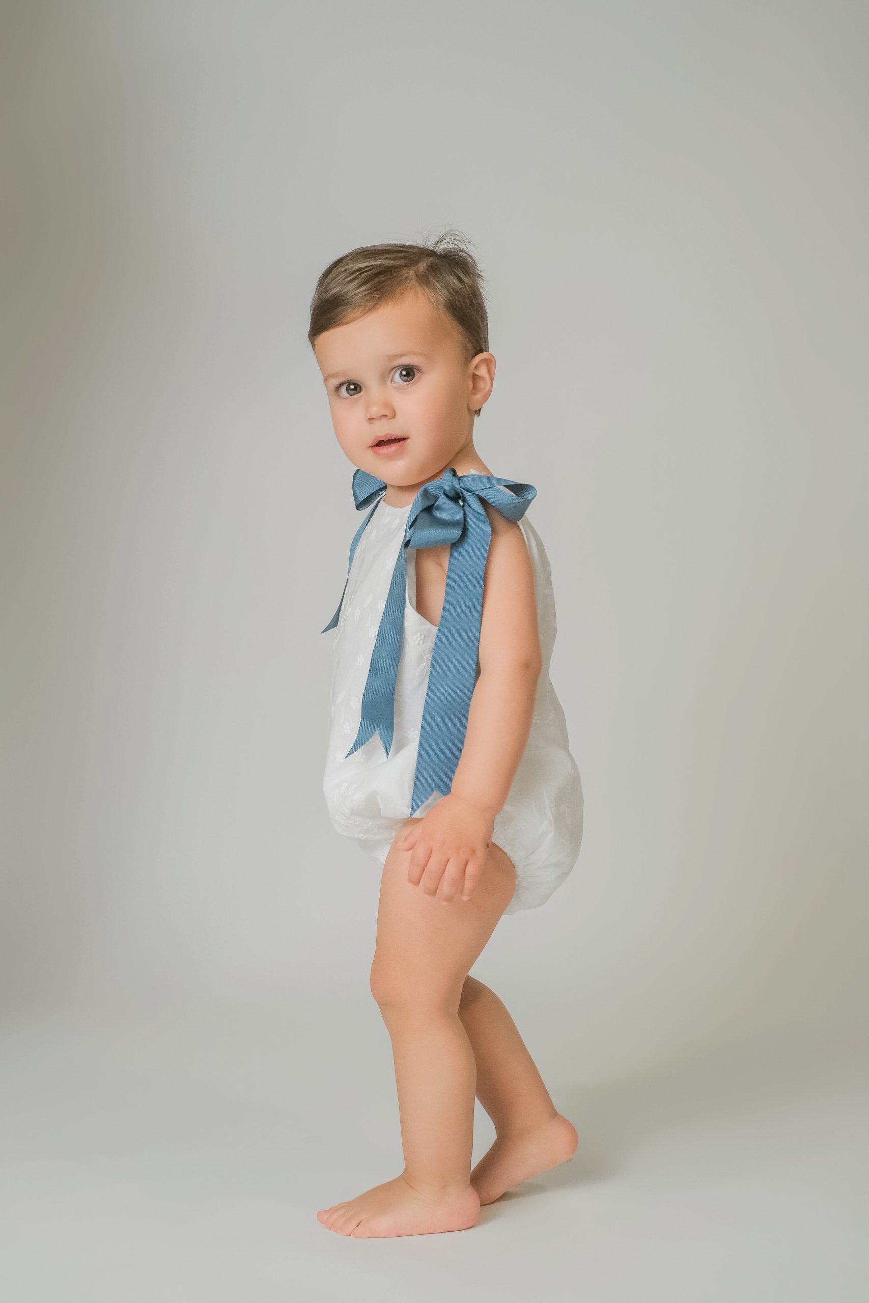 Pelele de batista bordada con lazos azul cobalto de quita y pon, se abrochan por un ojal para poder usar cualquier otro color. Precioso bordado en blanco y va abotonado por los laterales y por abajo para facilitar el cambio del pañal.