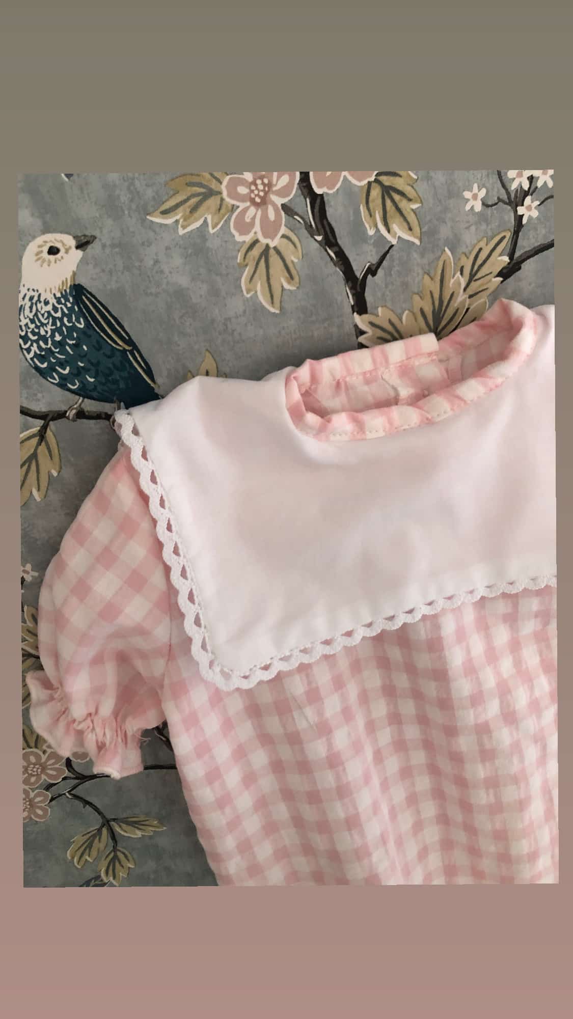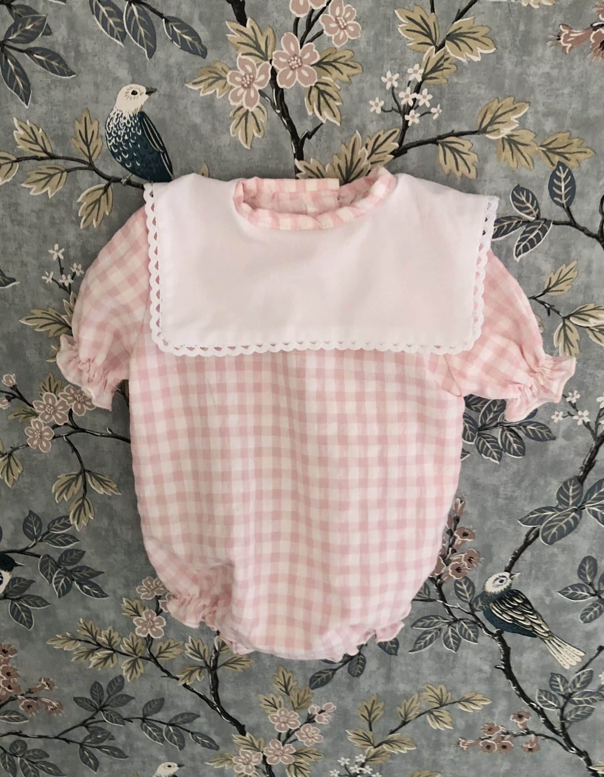 Pelele 100% algodón de cuadros vichy en tono rosa pastel, lleva un bonito cuello cuadrado con puntilla de ondas en blanca. Tallan a la edad, precioso modelo para los más pequeños.
