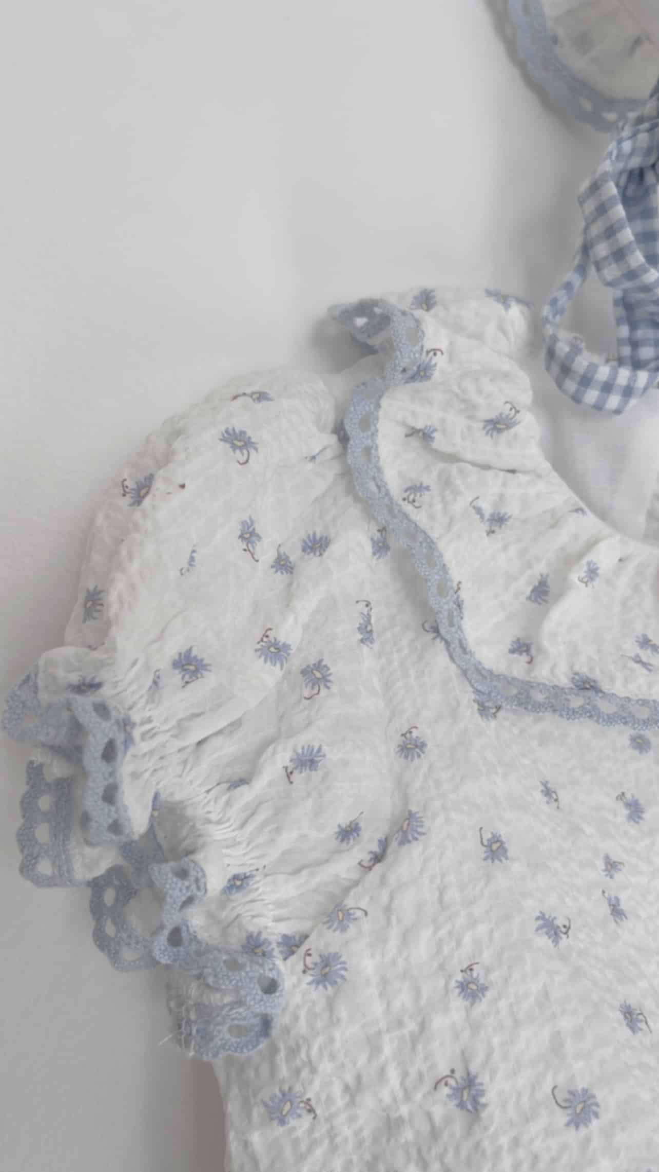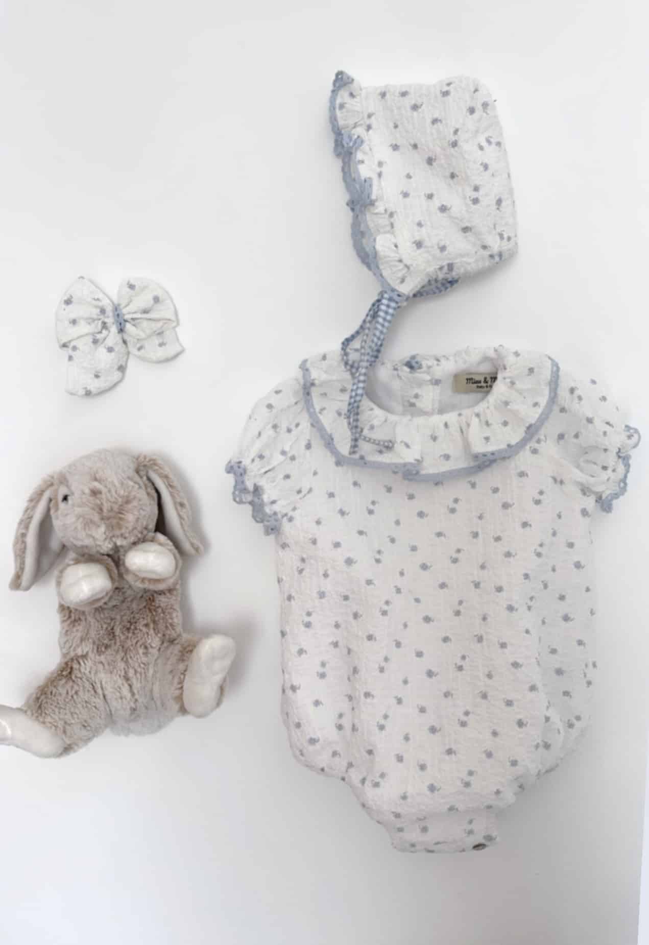 Bonito pelele con detalle cuello y flor baby blue, va forrado y con mangas farol. La capota no se incluye.