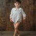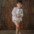 Pelele con cuello bebé, corte a la sisa y abotonado a la espalda, tiene abertura para facilitar el cambio de pañal. Va forrado en su interior. A modo decorativo lleva un botón de nácar en forma de estrella y tiene dos botones en madera.