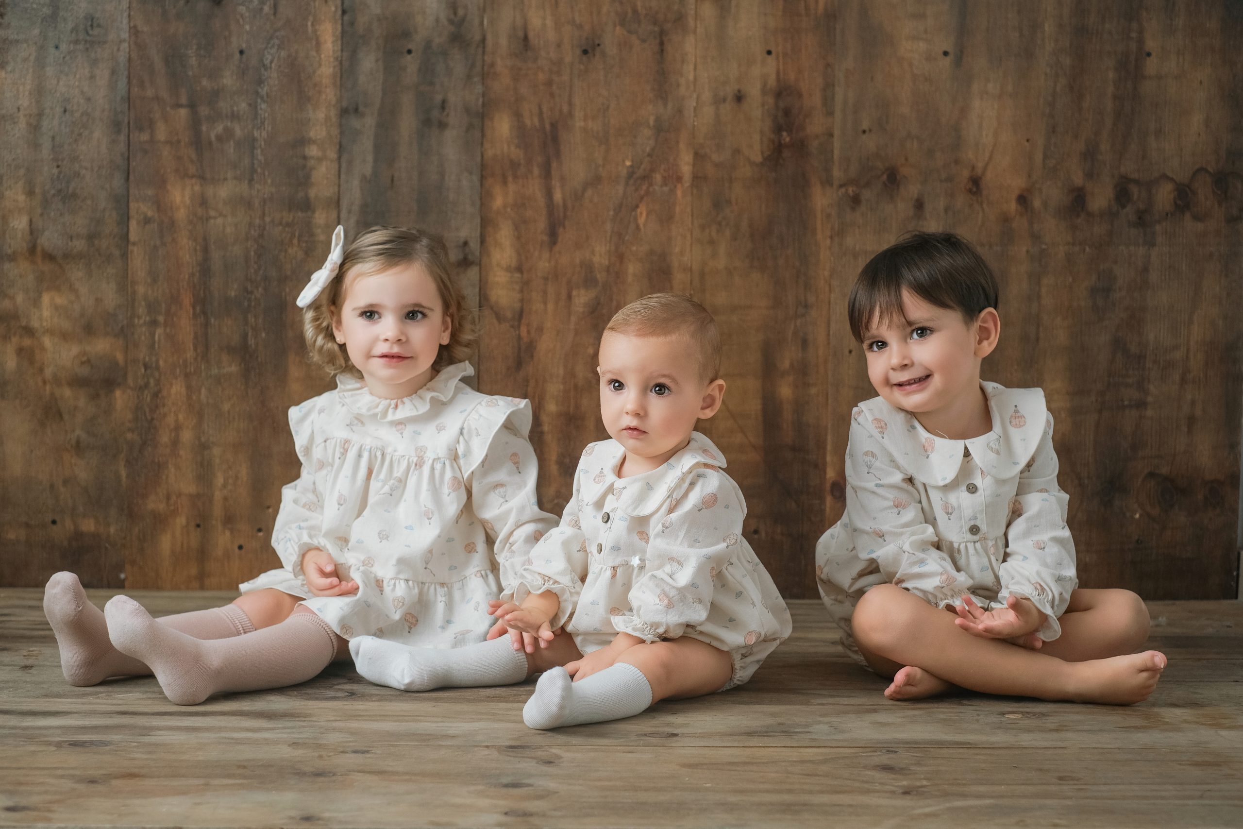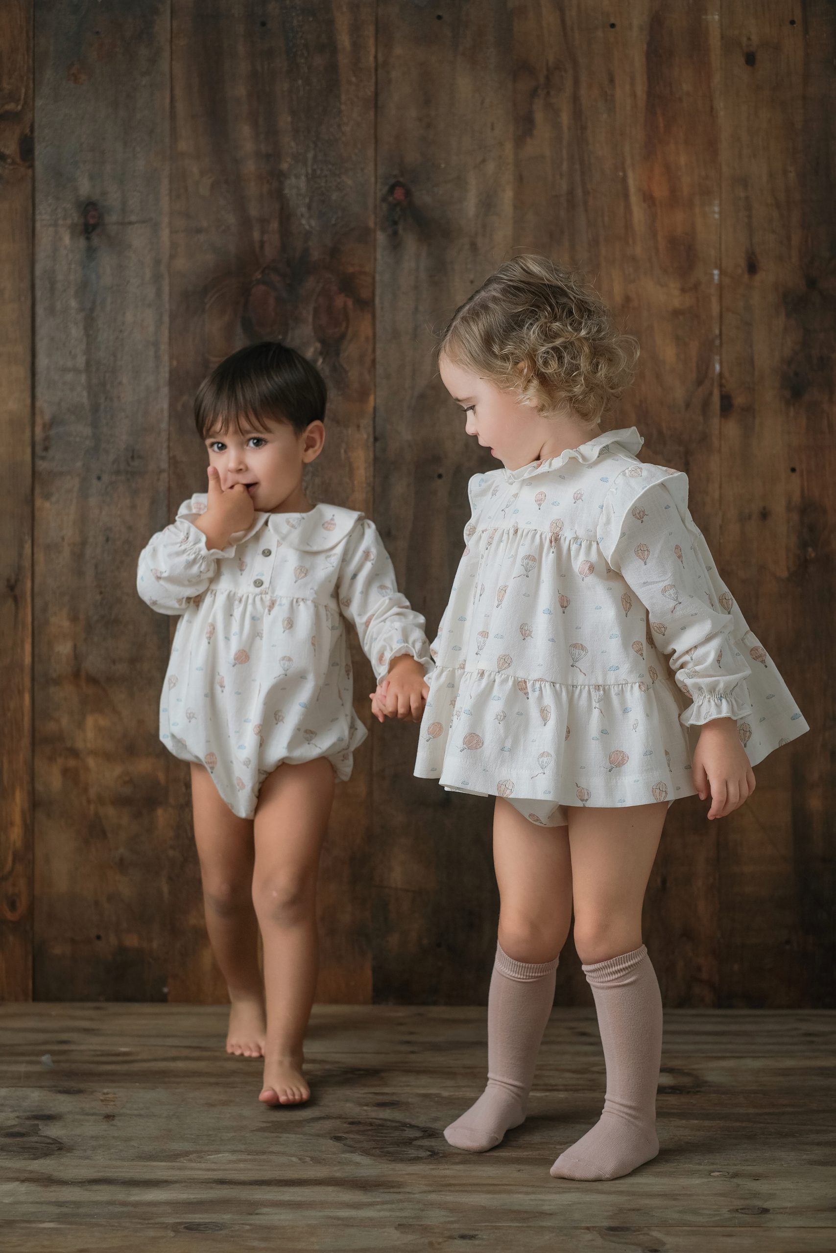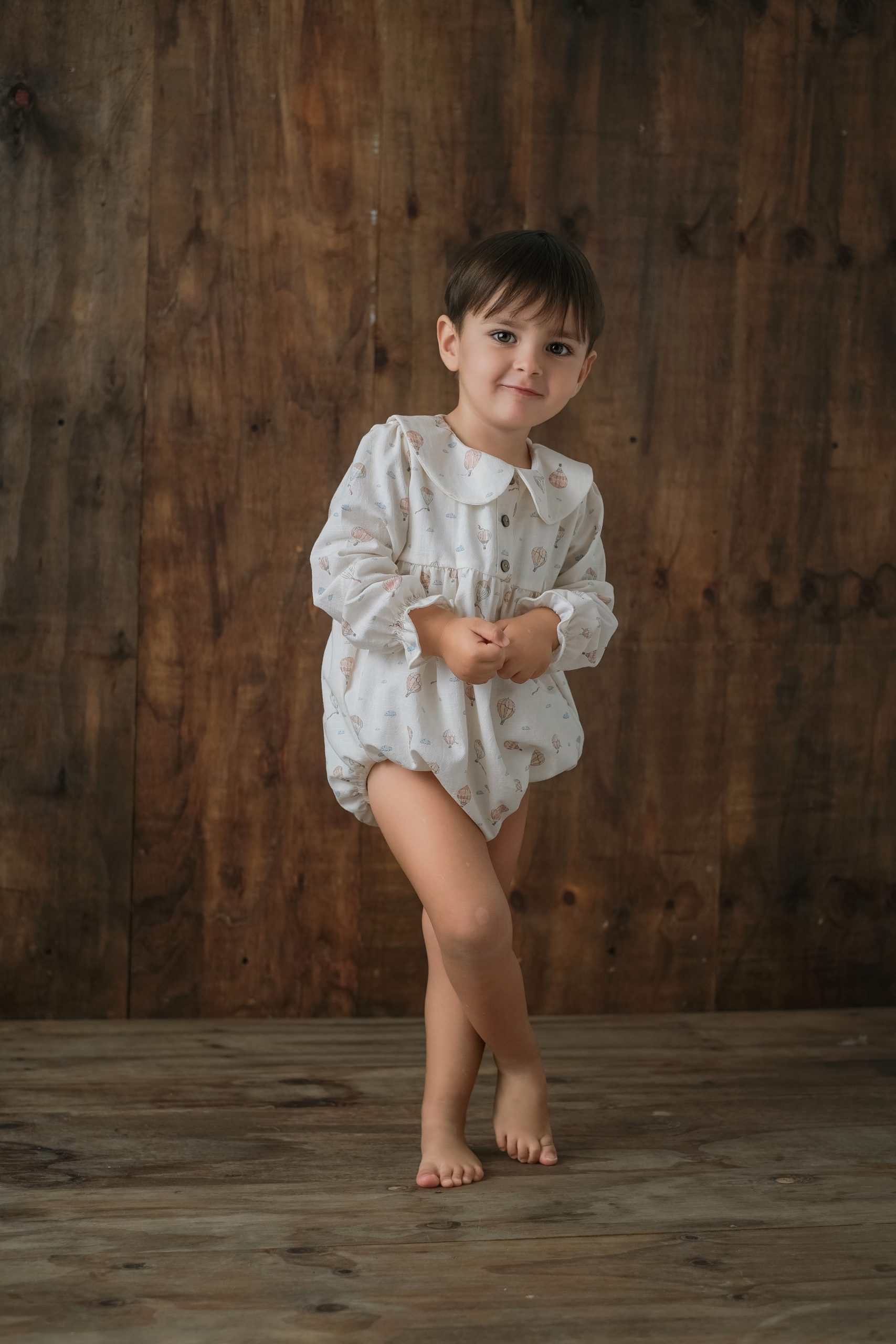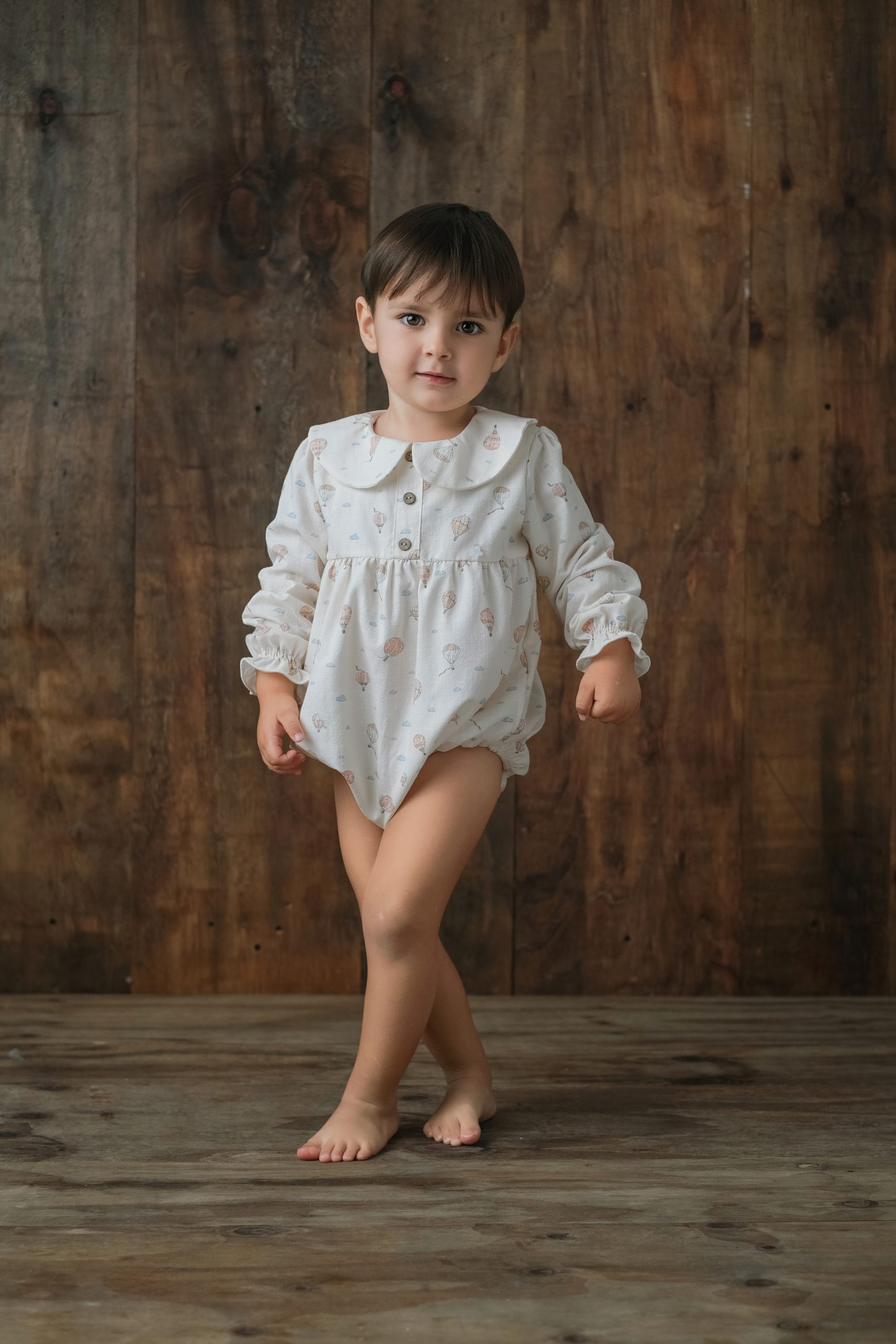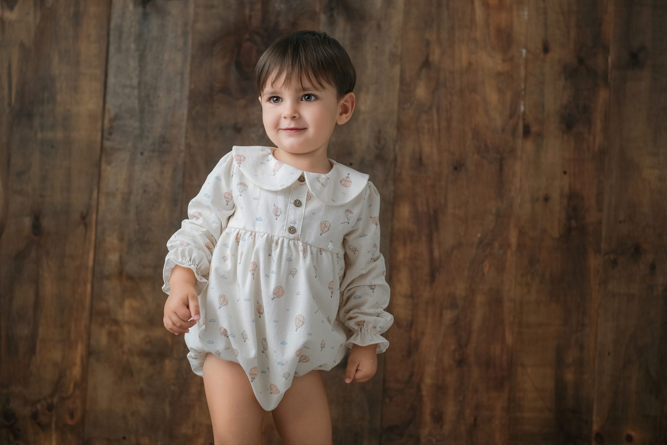 Pelele con cuello bebé, corte a la sisa y abotonado a la espalda, tiene abertura para facilitar el cambio de pañal. Va forrado en su interior. A modo decorativo lleva un botón de nácar en forma de estrella y tiene dos botones en madera.