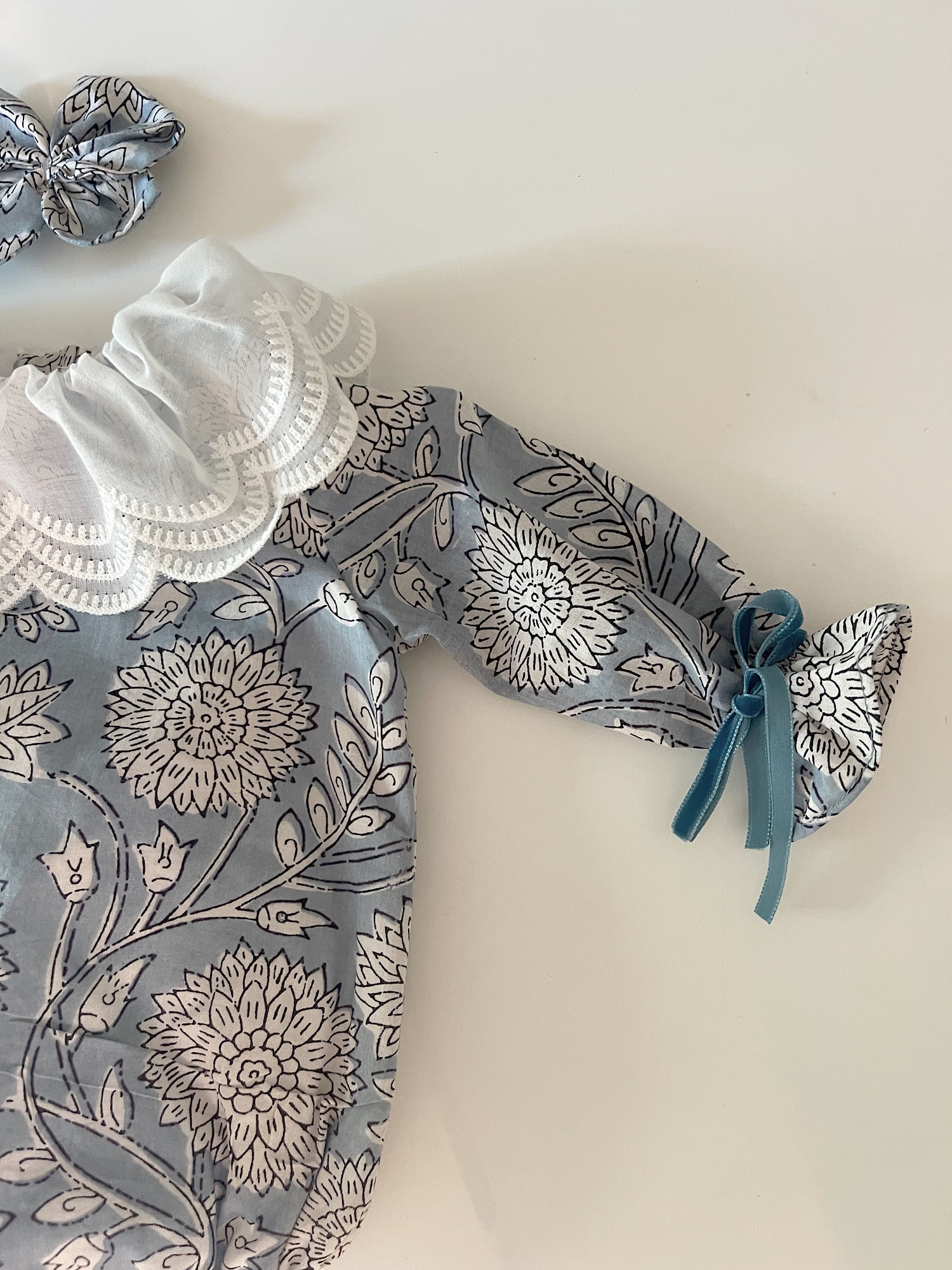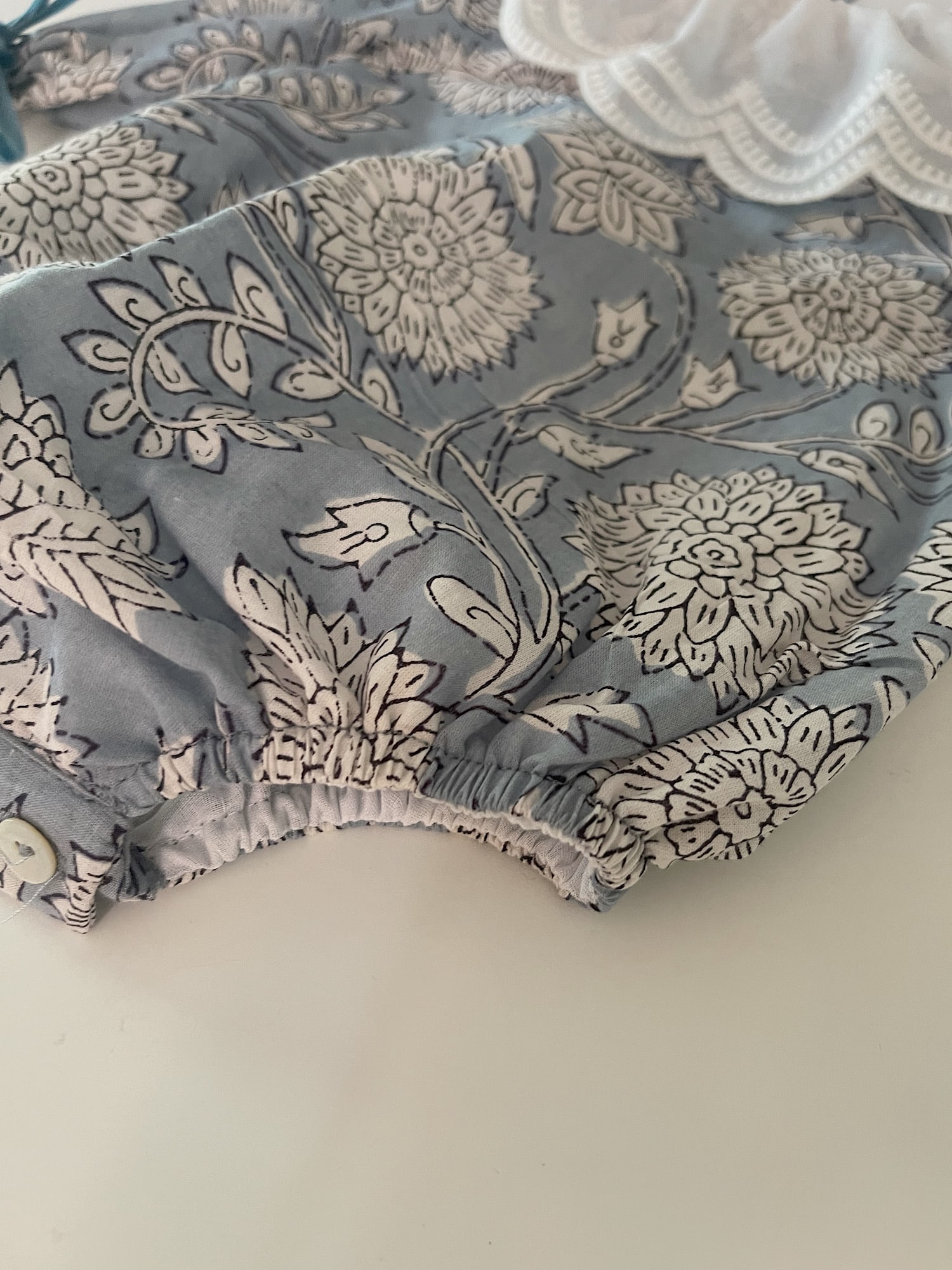 Pelele con cuello de guipur y detalles en los puños con cinta de terciopelo. Tela India, va totalmente forrado, recomendamos lavar con un centrifugado suave y en frío para conservar su color original