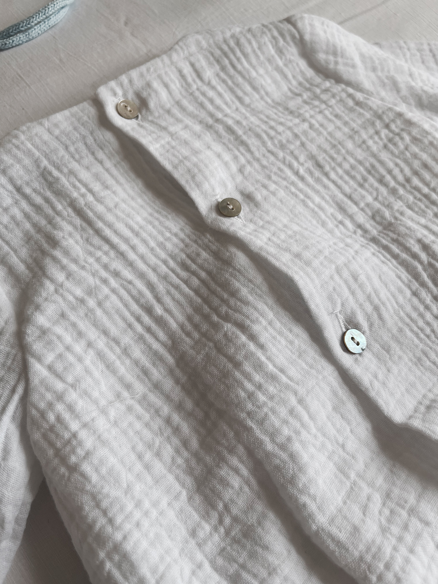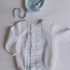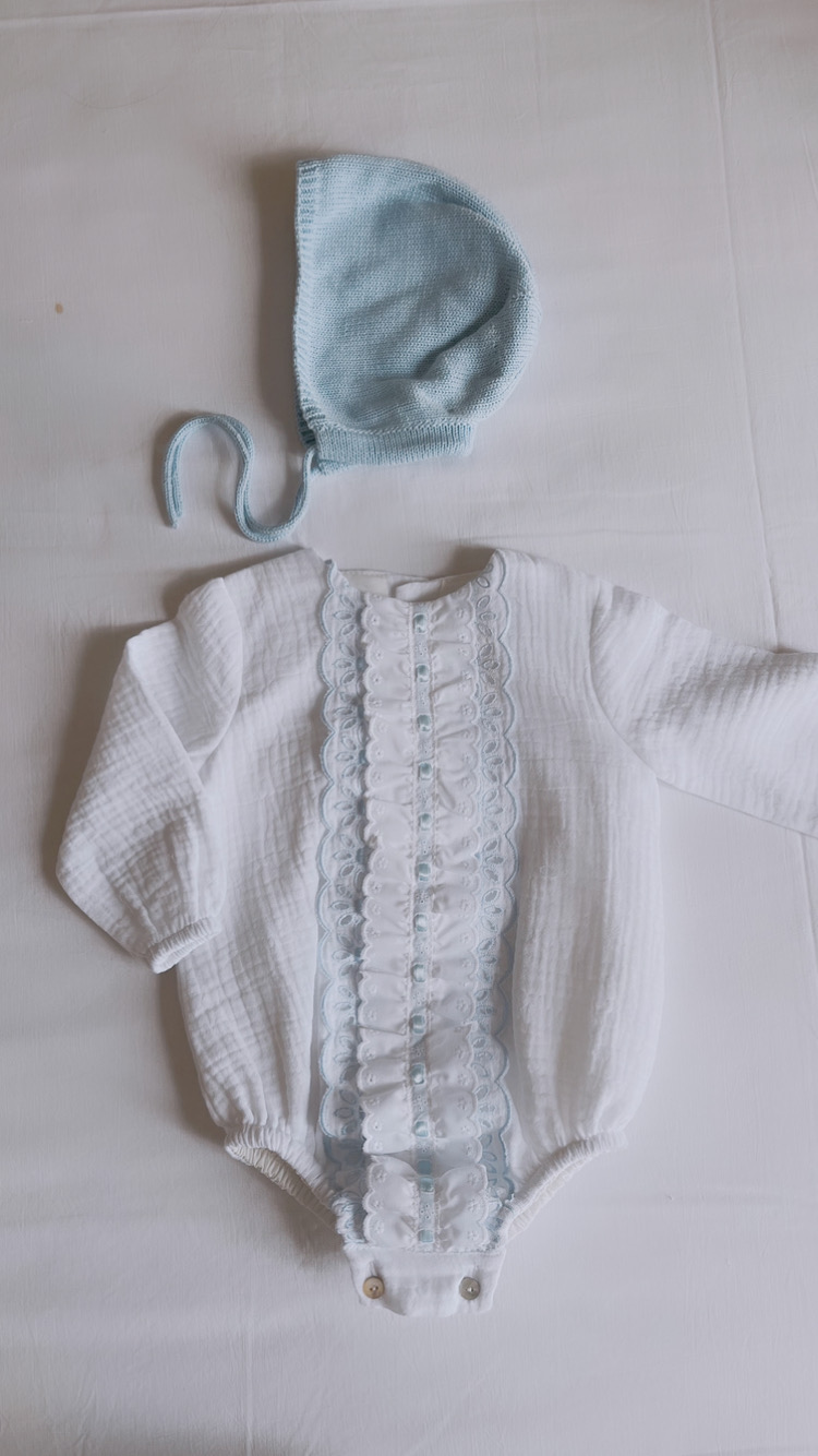 Pelele bambula blanca 100% algodón con tira bordada perforada en celeste y pasa cinta, lleva abertura por la espalda y por el pañal con botones de nácar.