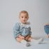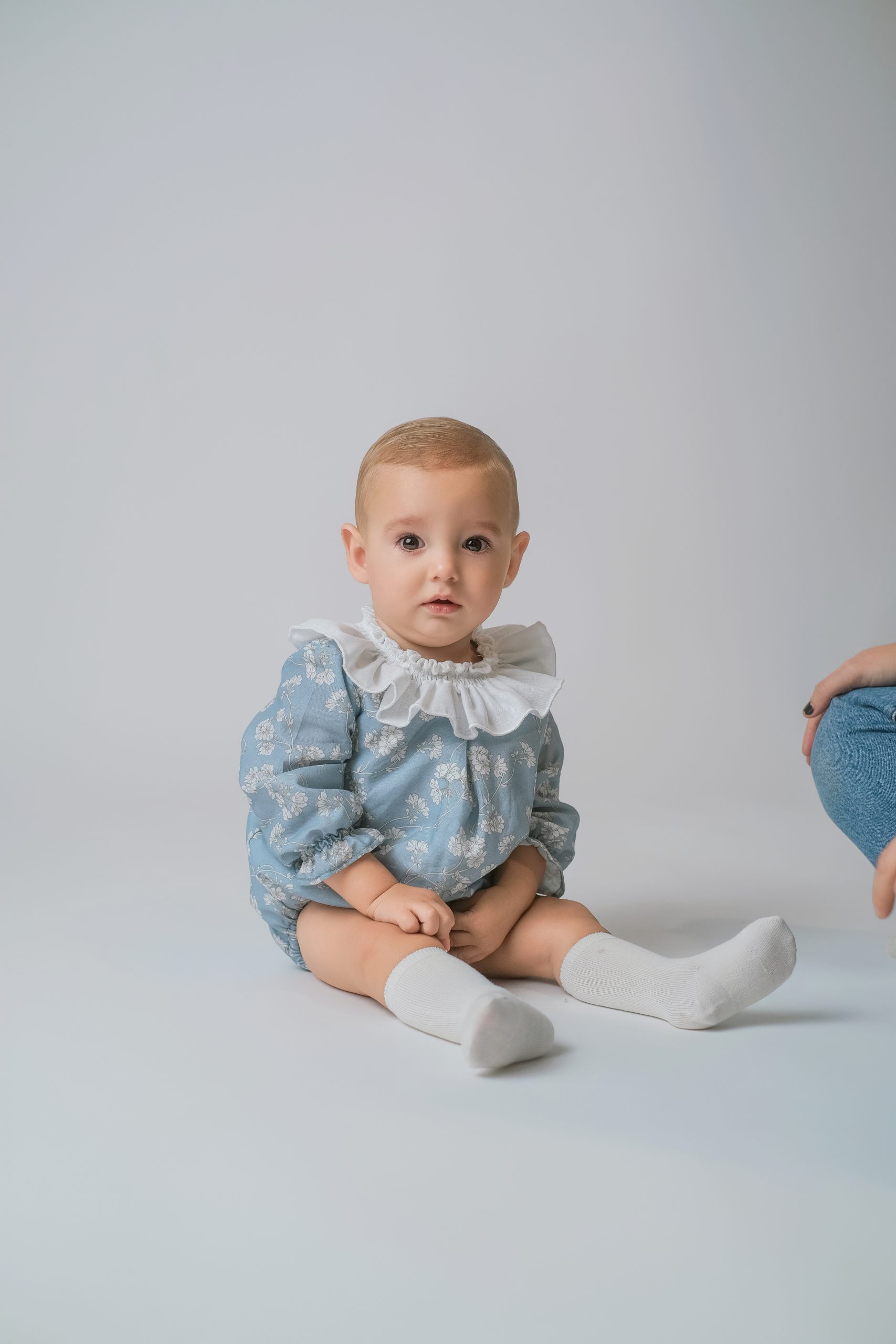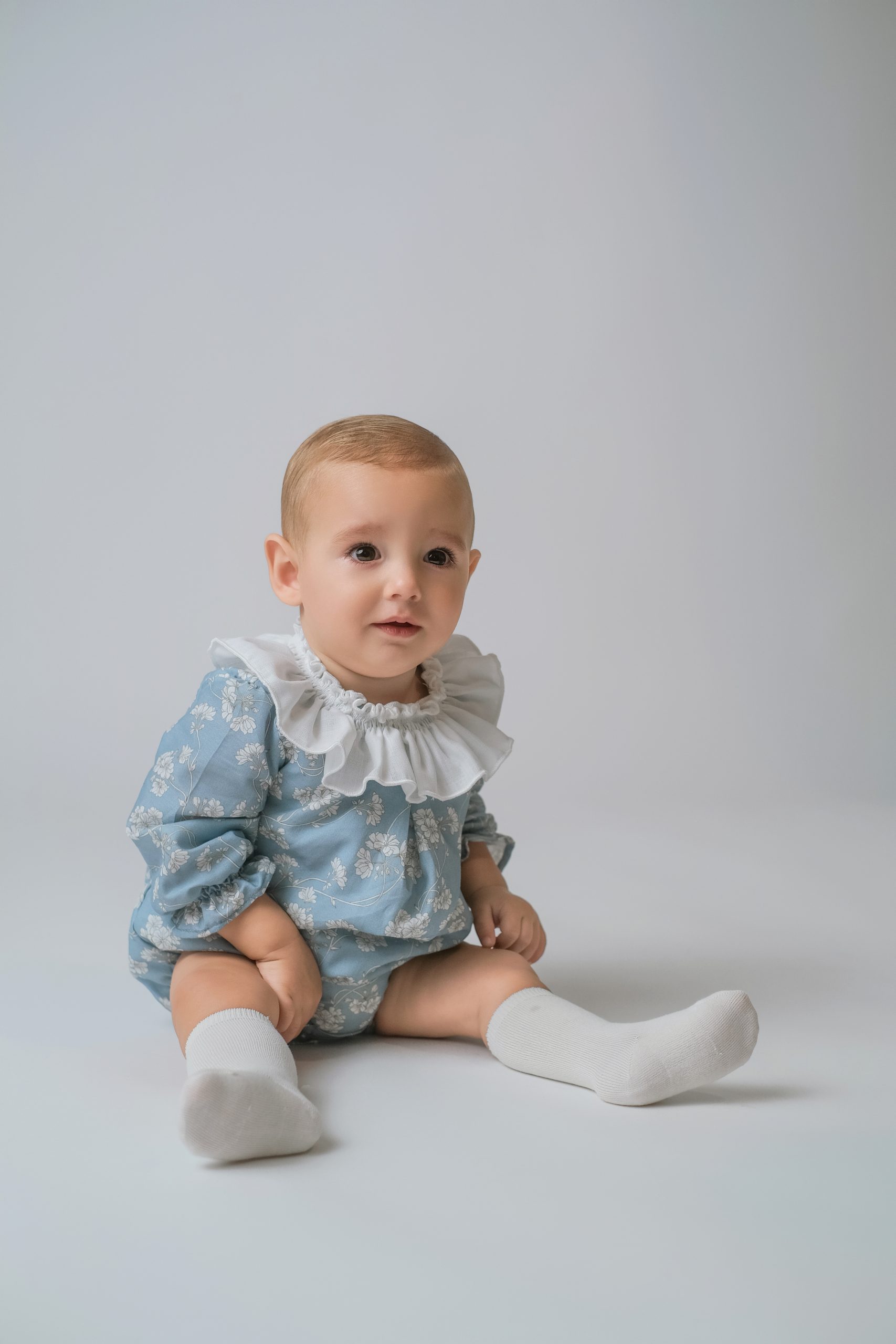 Pelele de algodón, estampado Manuela, va forrado por dentro y abotonado en la espalda y por abajo para facilitar el cambio de pañal. Precioso cuello fruncido en blanco roto de Lino.