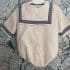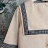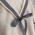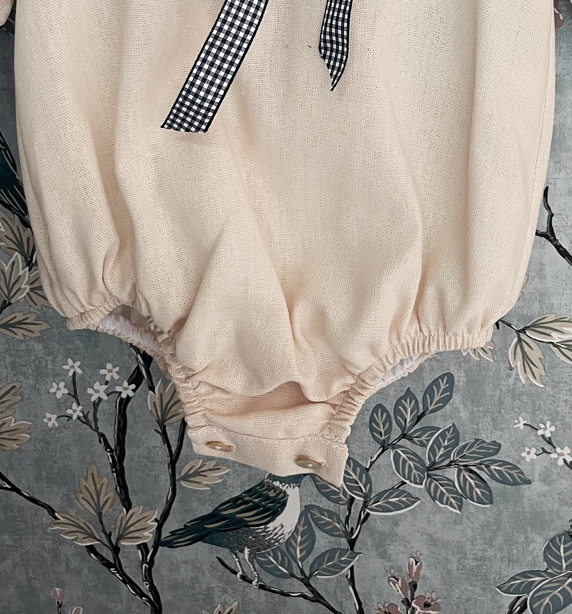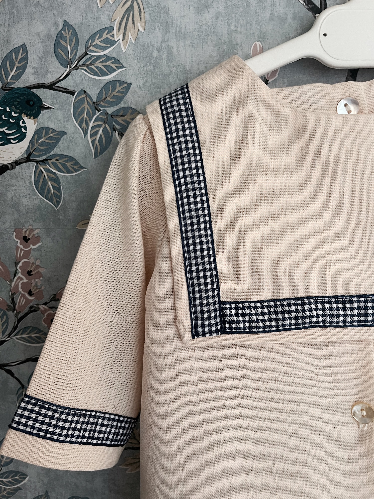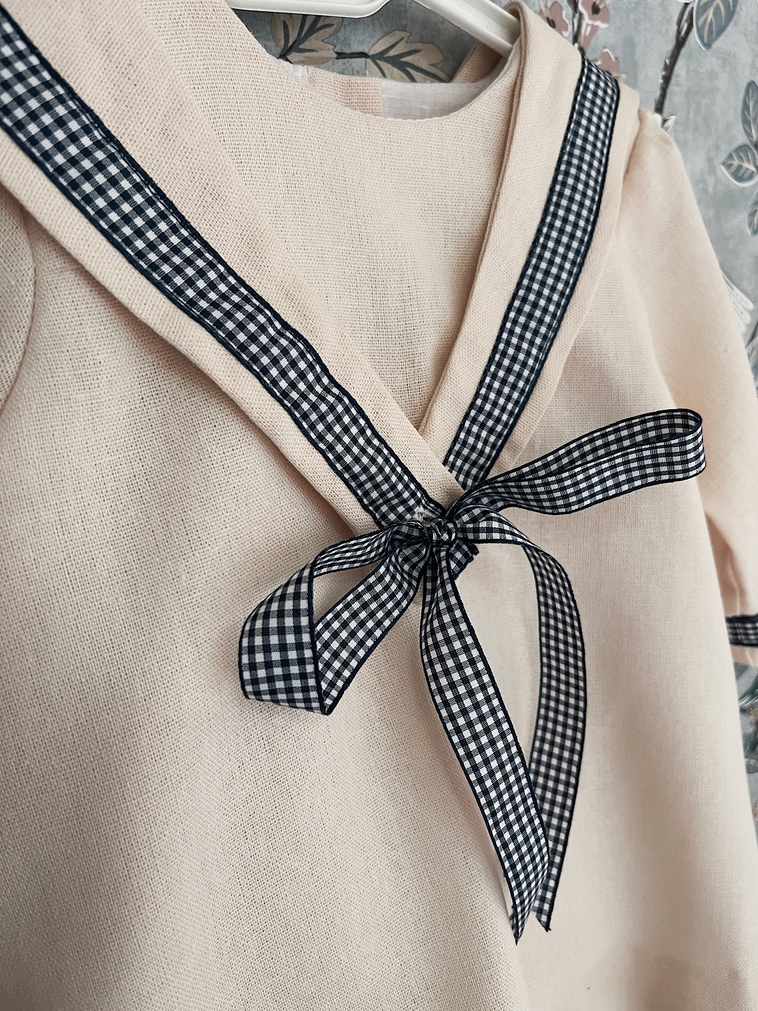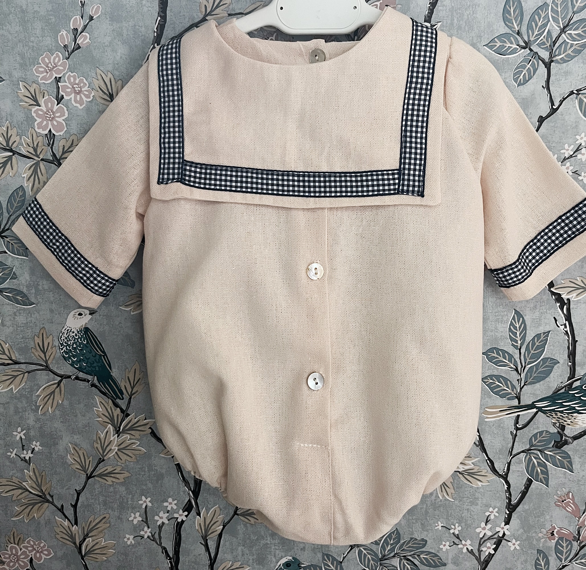 Pelele de Lino beige con cuello cuadrado de quita y pon abrochado con lazo vichy azul marino. Totalmente forrado.