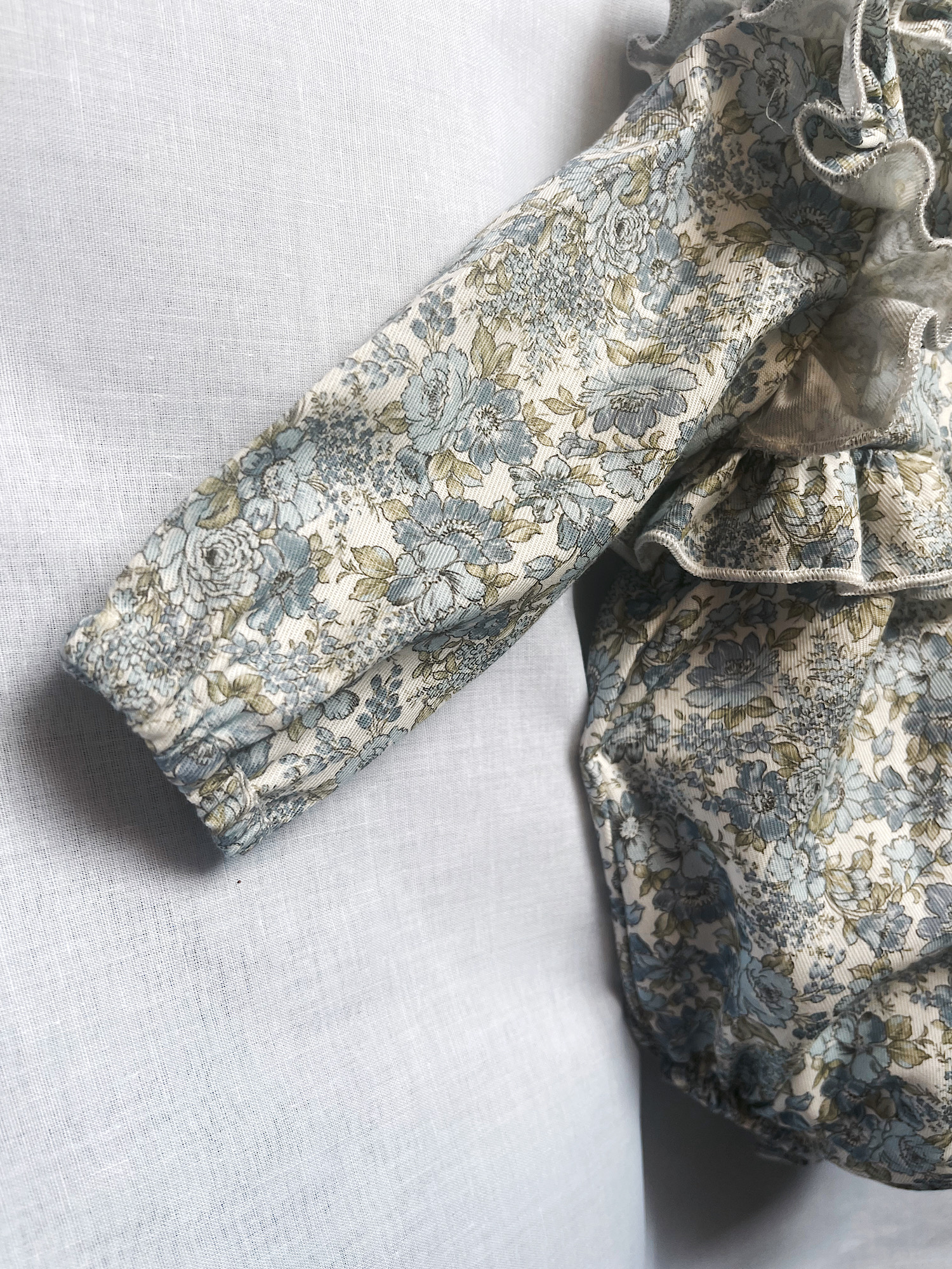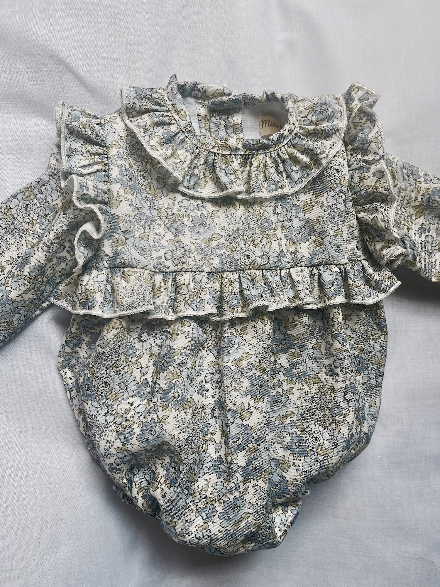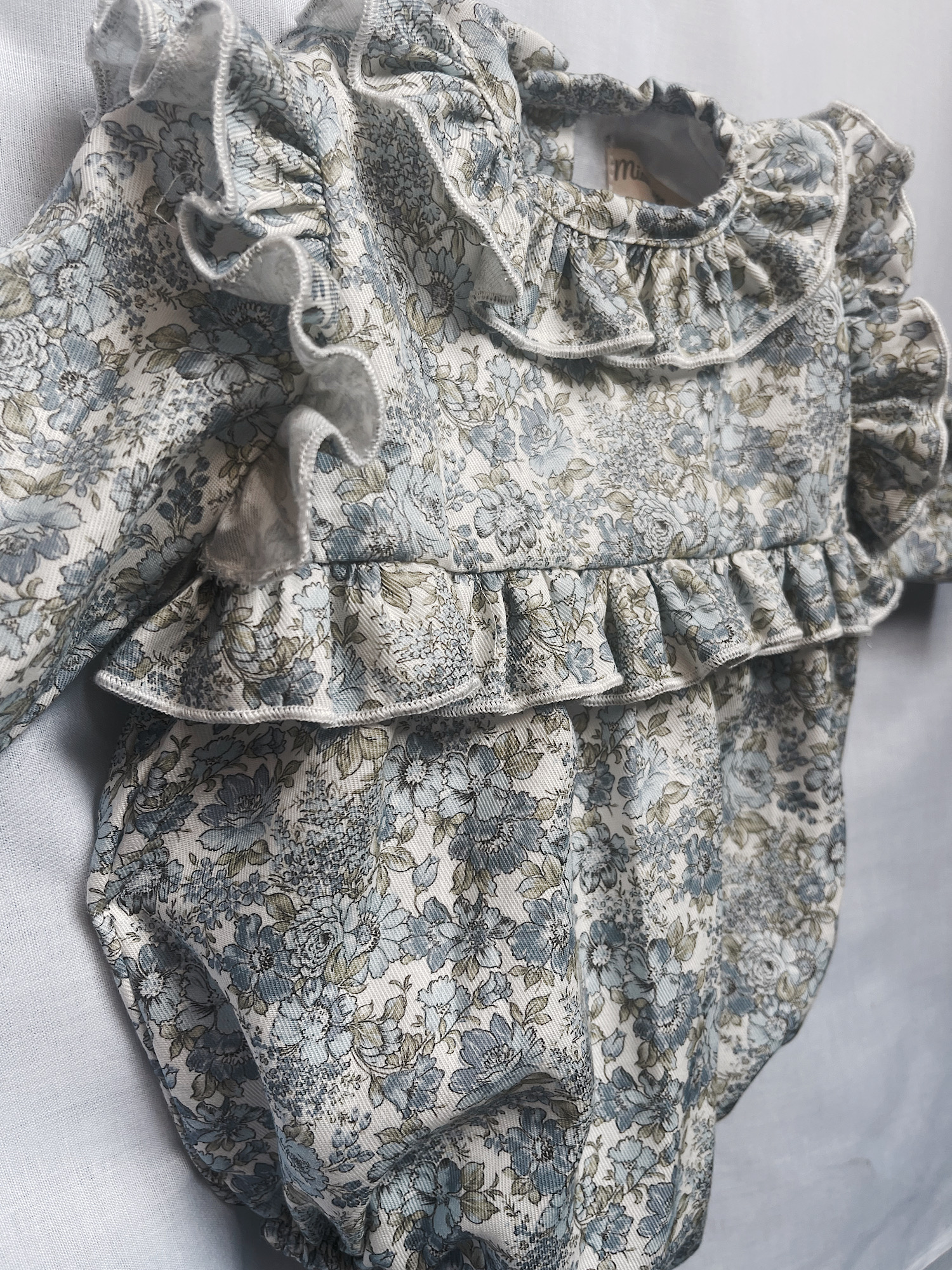 Pelele de Viyela con un precioso estampado de flores en tonos azules y celestes, 100% algodón.