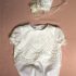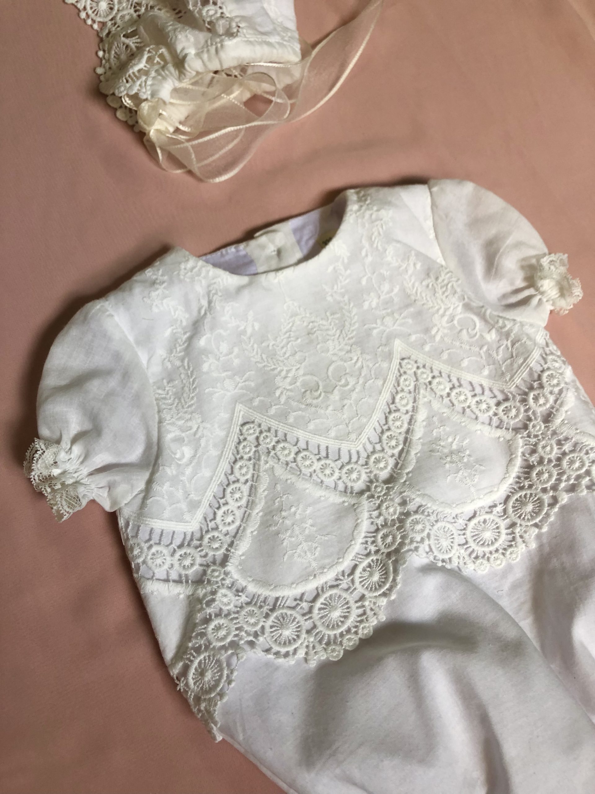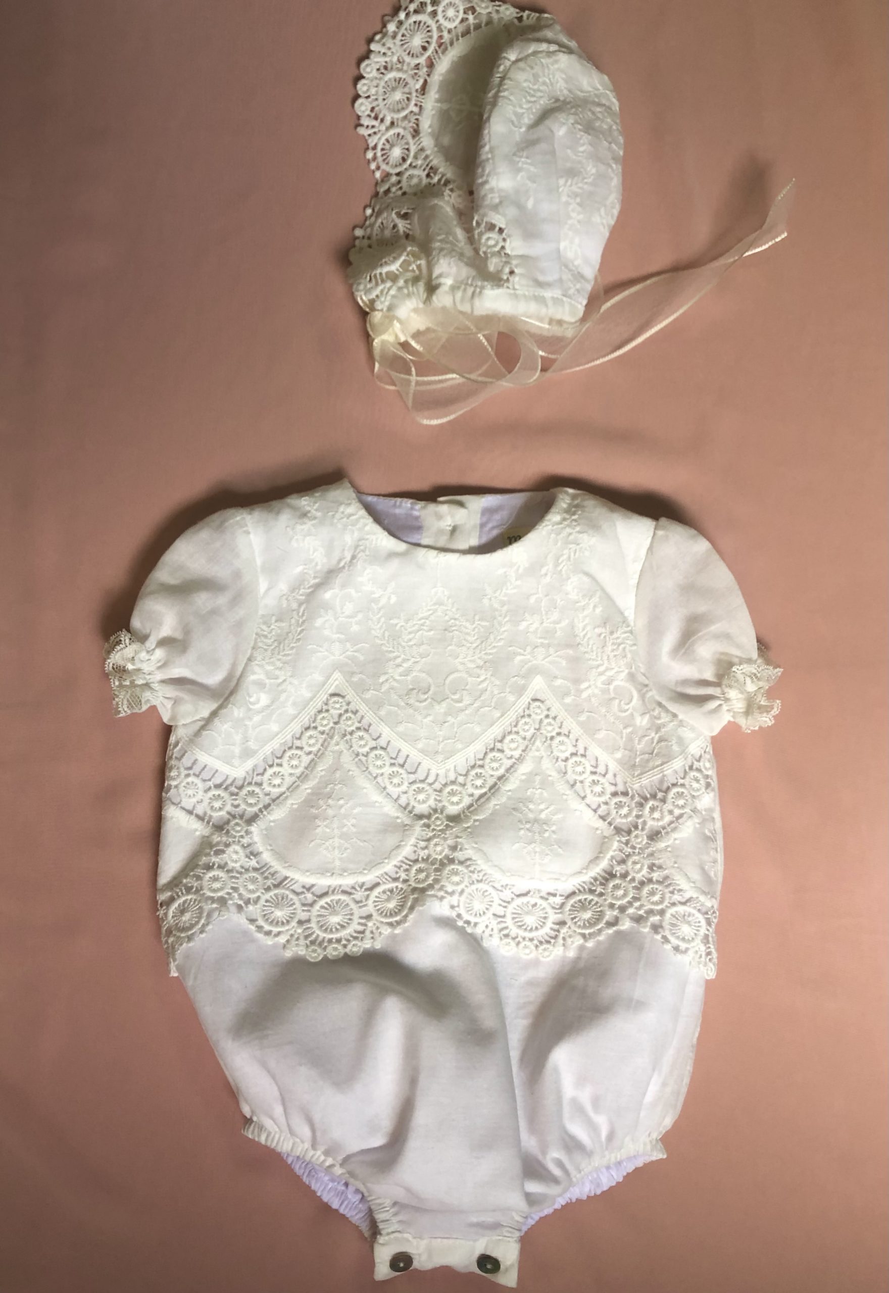Precioso Pelele de batista para las ocasiones más especiales, va forrado y abotonado por la espalda y cambio del pañal con botones de nácar, lleva un pecherin con el bordado y encaje en el filo de las mangas.