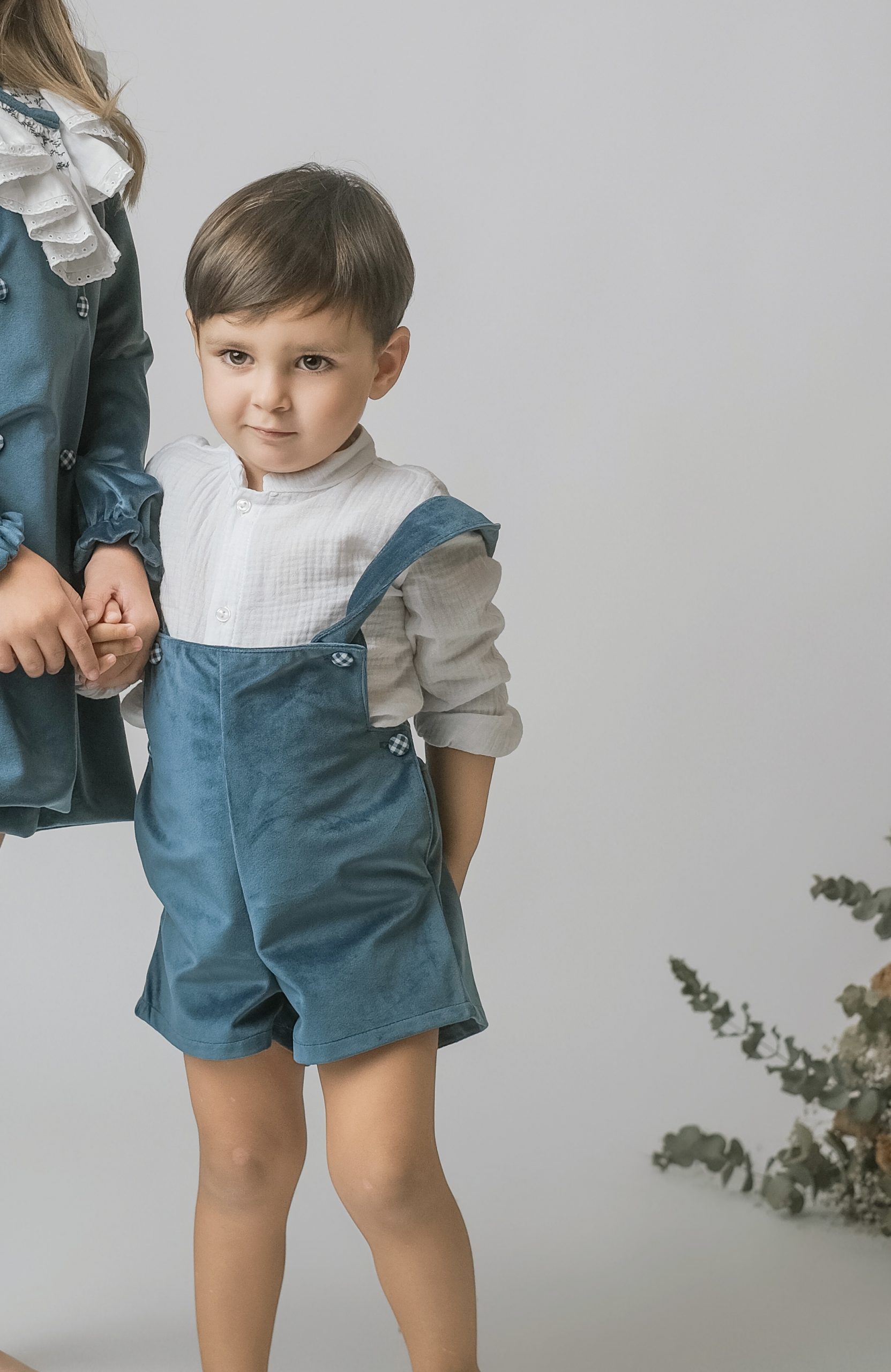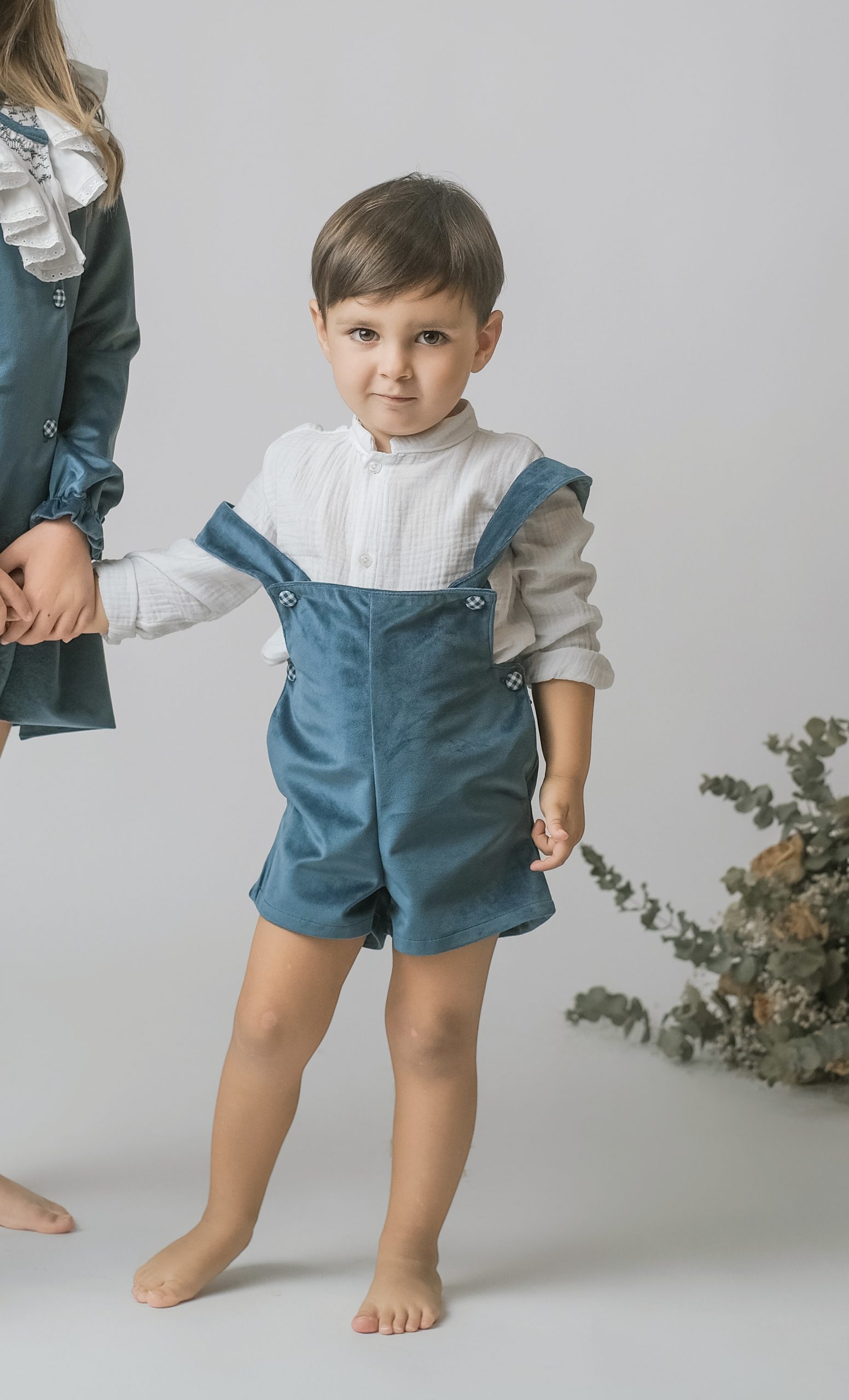 Peto Velvet totalmente forrado, botones forrados en vichy, su tejido es terciopelo azul petróleo. Un look elegante y precioso para ceremonia como para estas fechas.