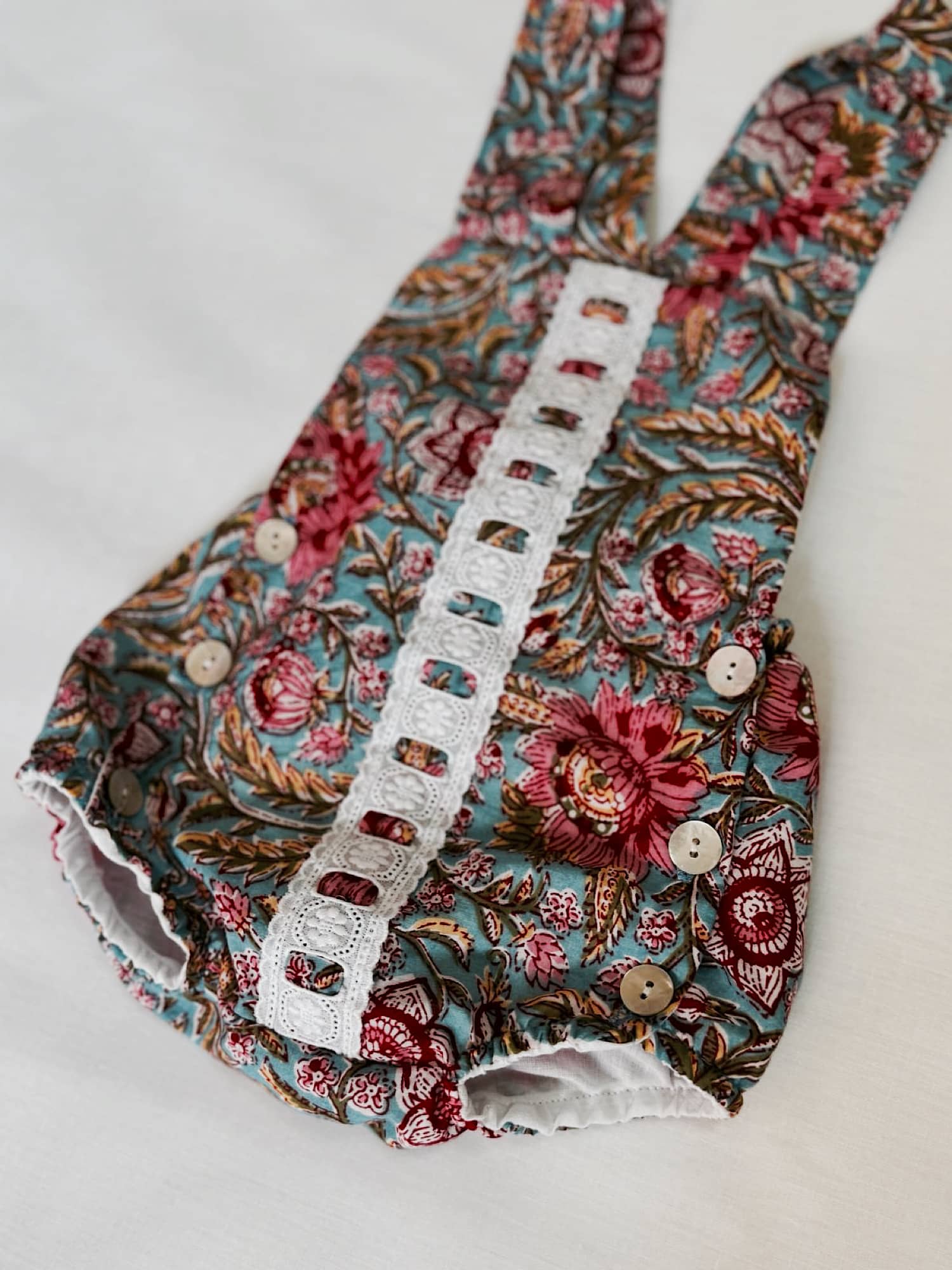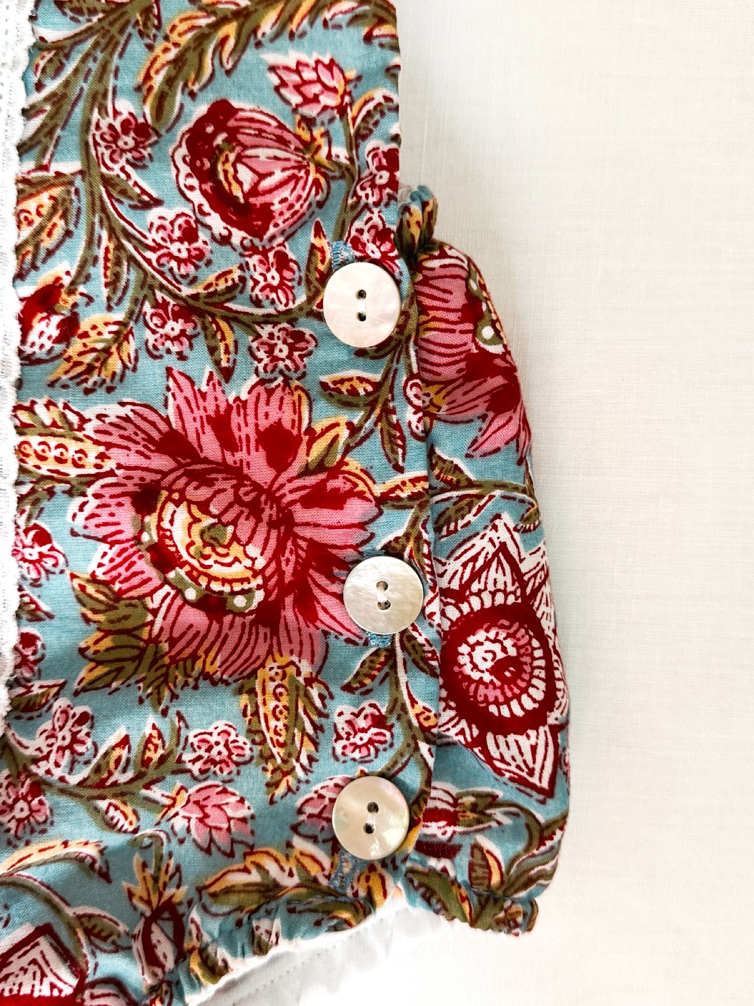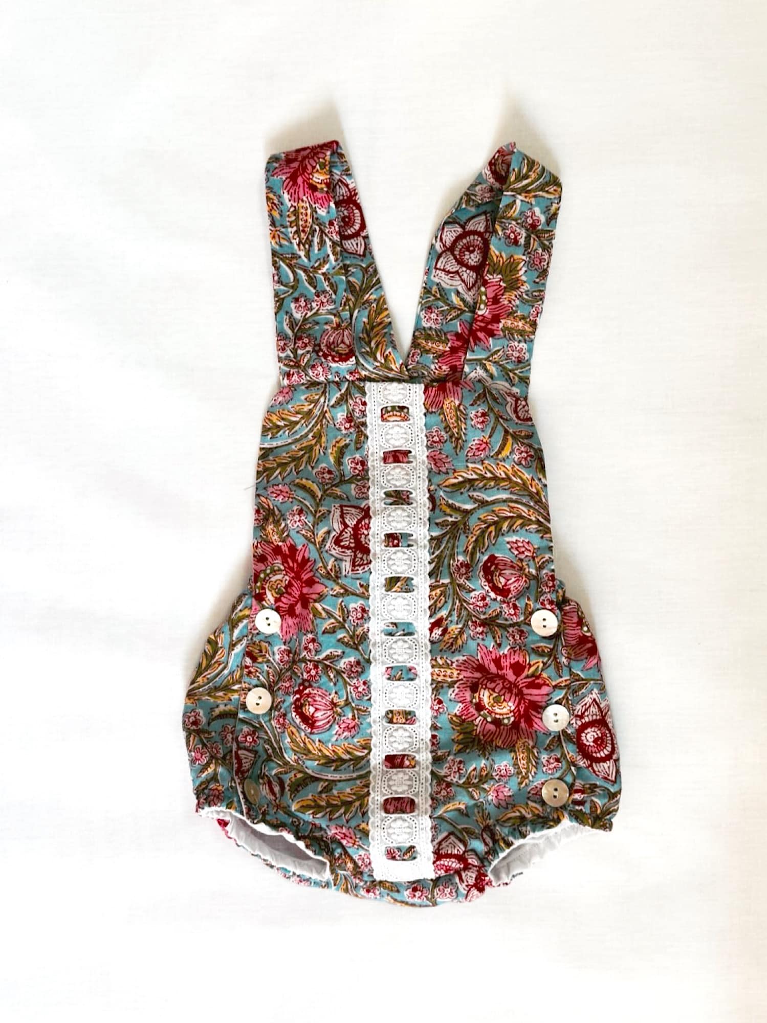 Ranita con estampado Indio floral en tonos turquesas, rosas y blancos. Va forrada y abotonada por los laterales y como detalle lleva una tira bordada en el centro.