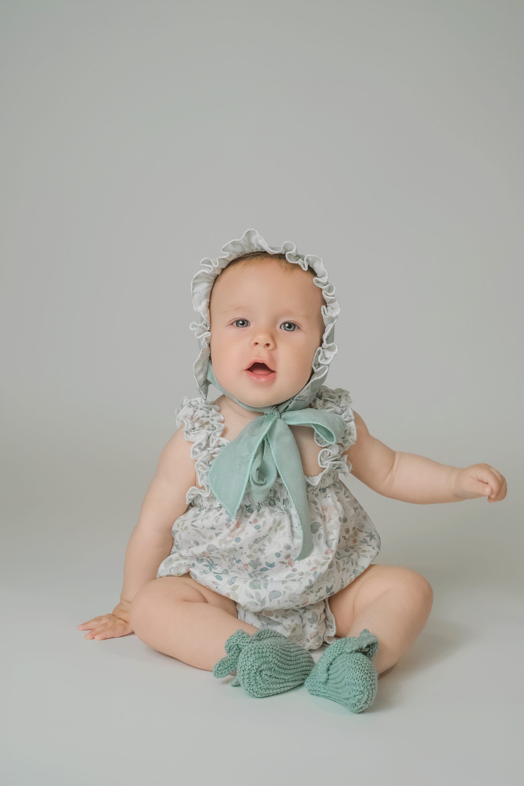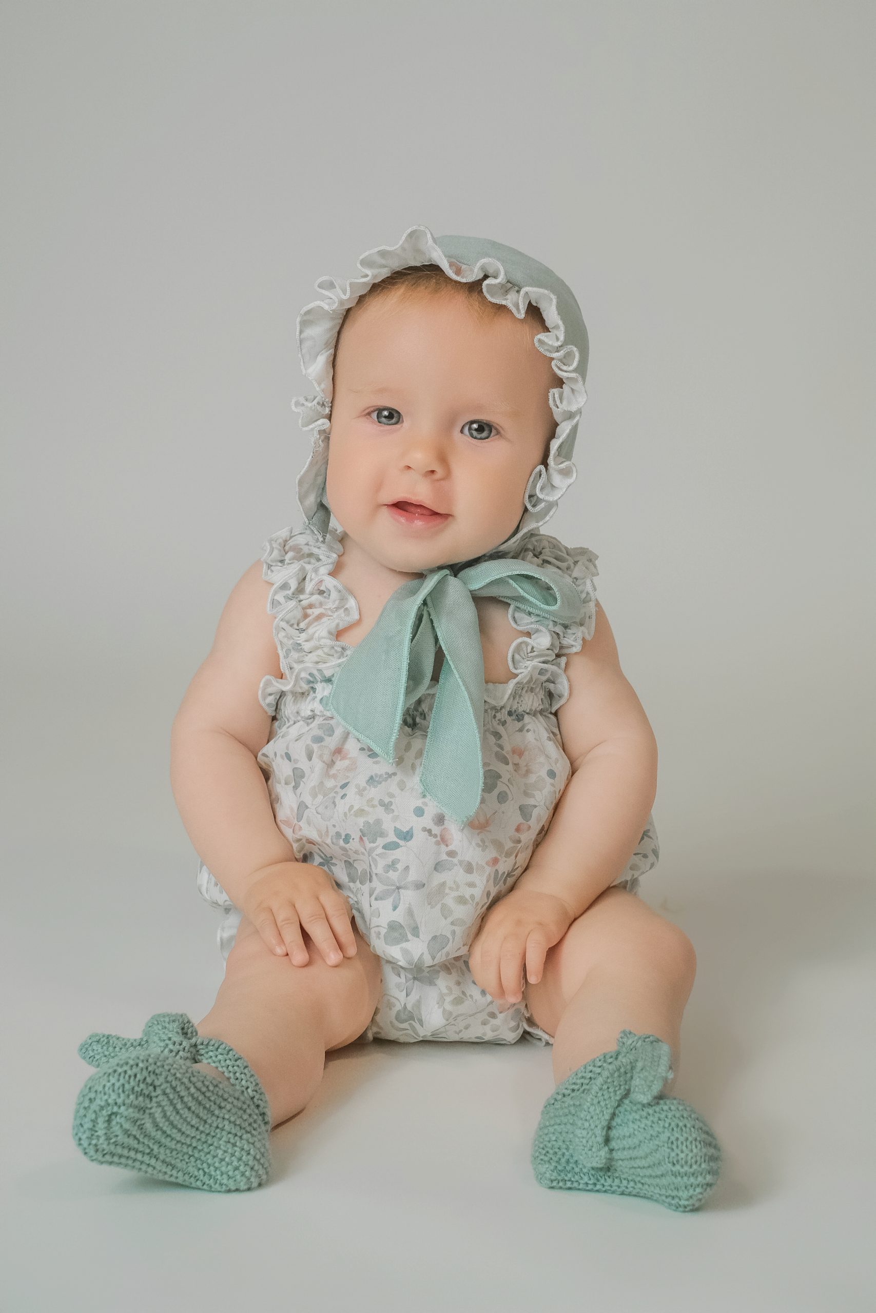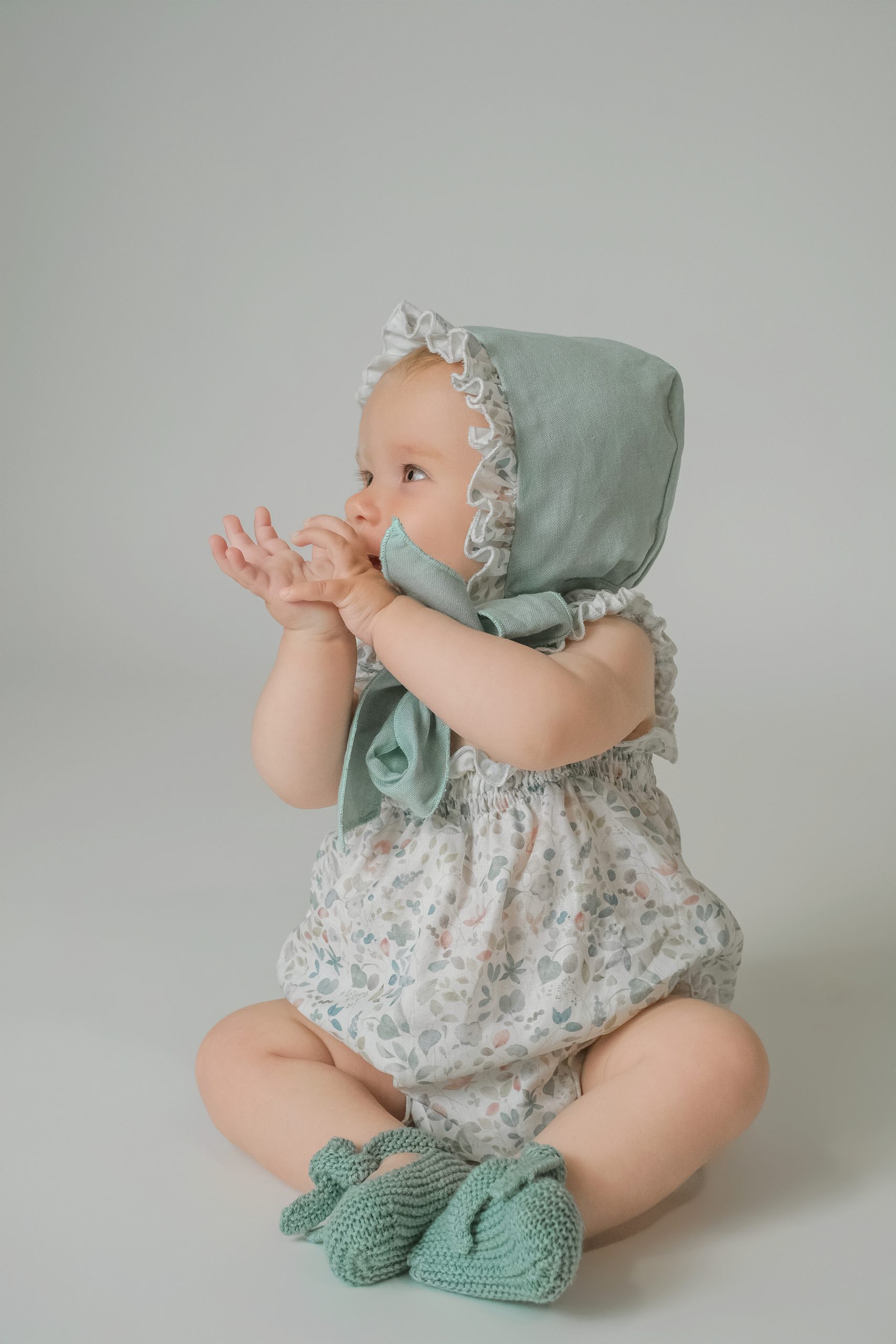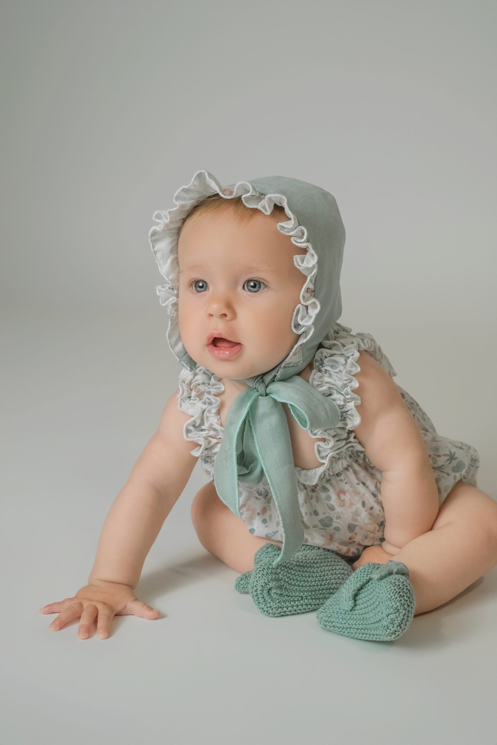 Ranita flor acuarela en tonos verdes, va fruncida y es muy elástica. No va forrada, ya qu no lo necesita. Una prenda muy cómoda.