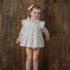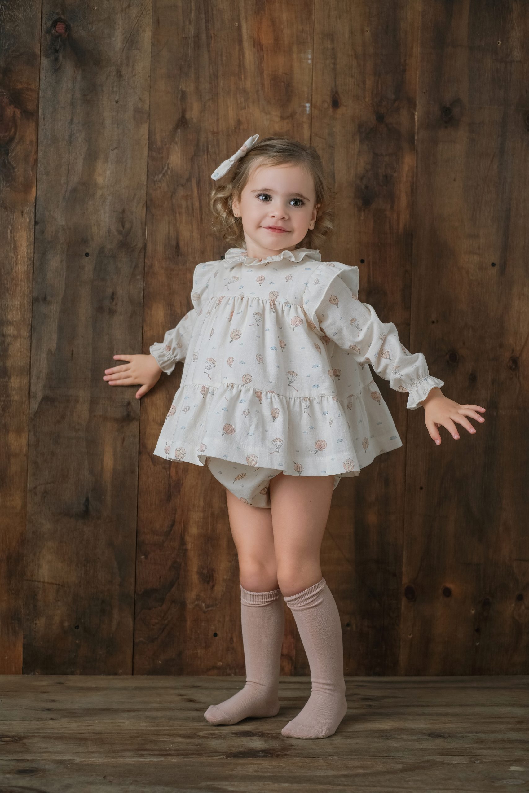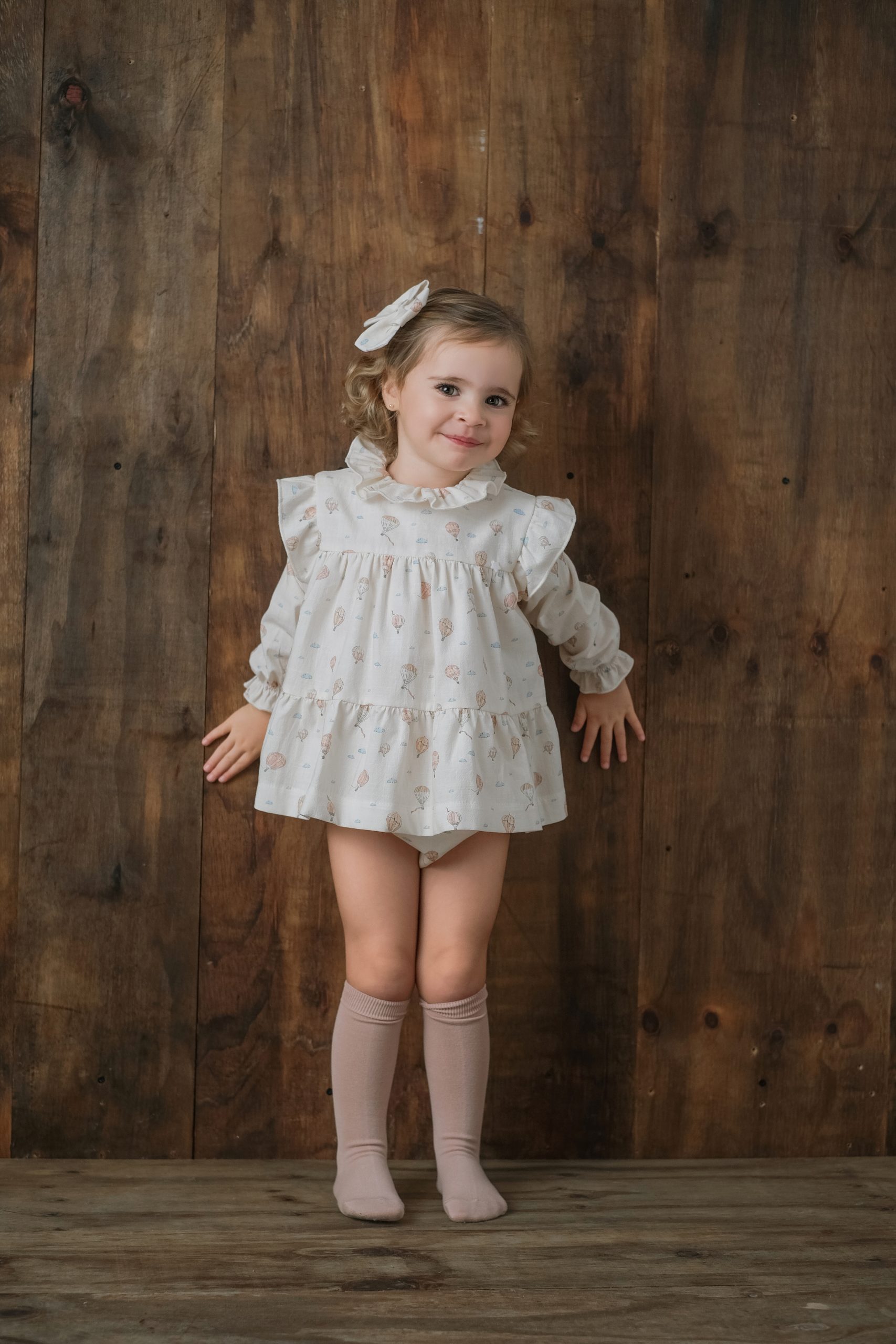 Precioso vestido con estampado de Globos y nubes en tonos pastel que lo hacen dulce y delicado, va totalmente forrado y lleva como detalle un botón de nácar a modo de decoración. Talla a la edad.Las tallas pequeñas son jesusitos con braguitas y a partir de 4 años su largo es de vestidito.