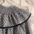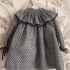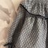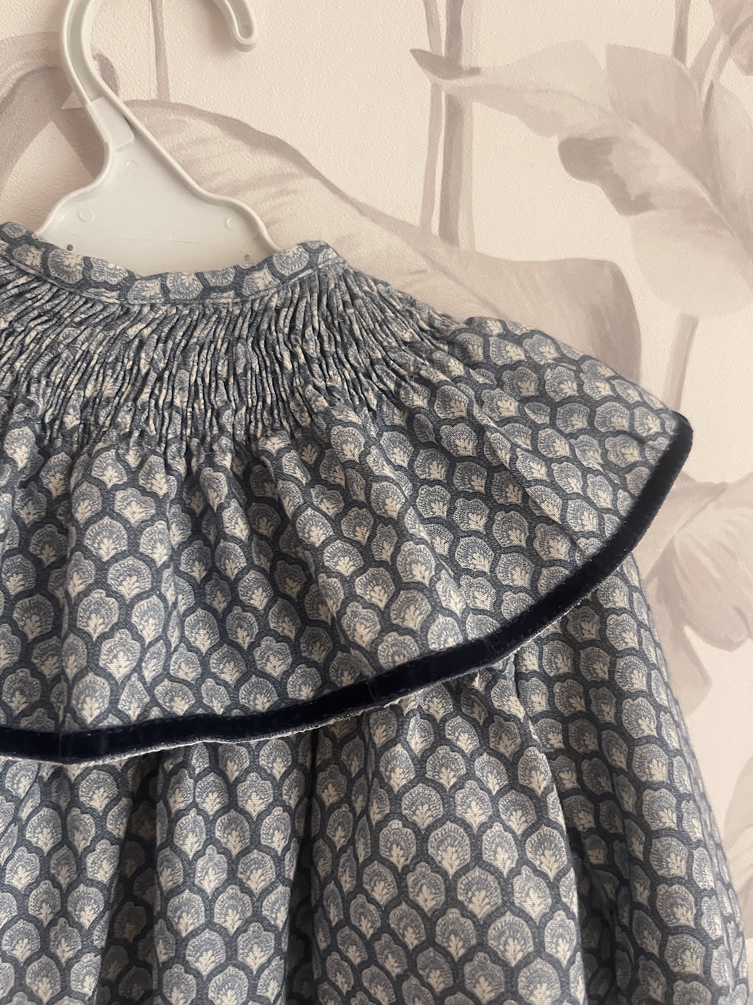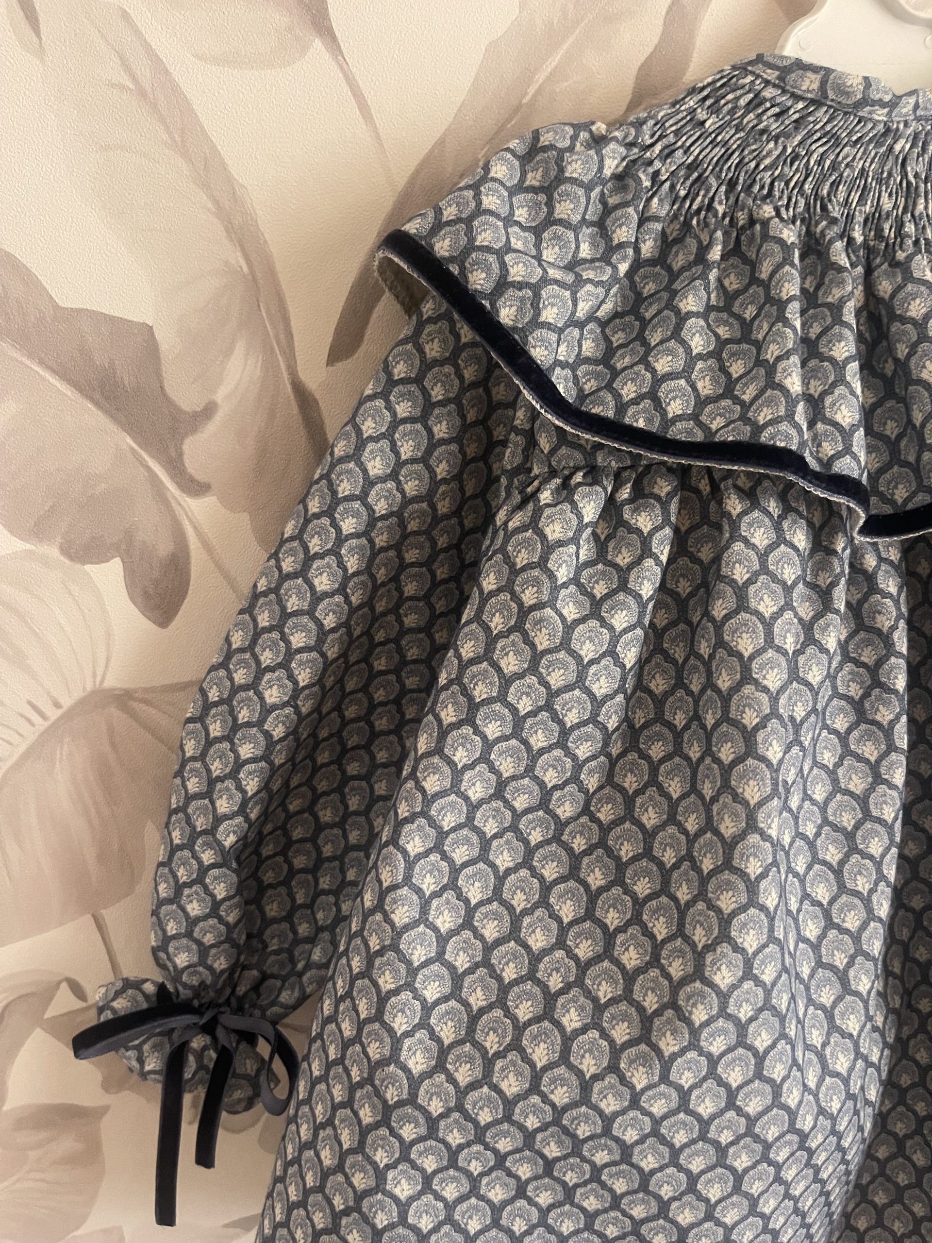 Tejido precioso de algodón con cuello fruncido y detalle en filo y puños de terciopelo azul marino. Hasta 3 años incluye braguitas. Tallan a la edad.