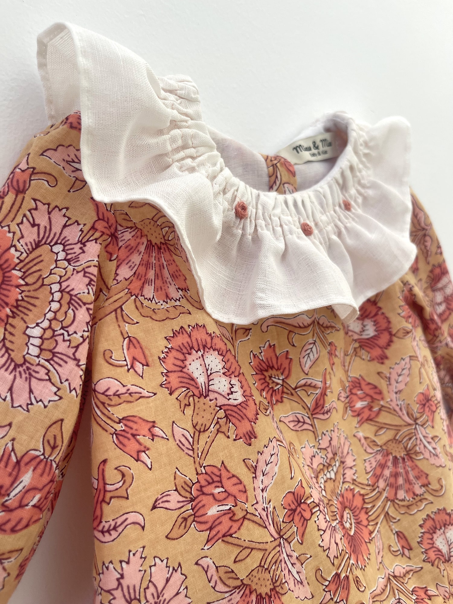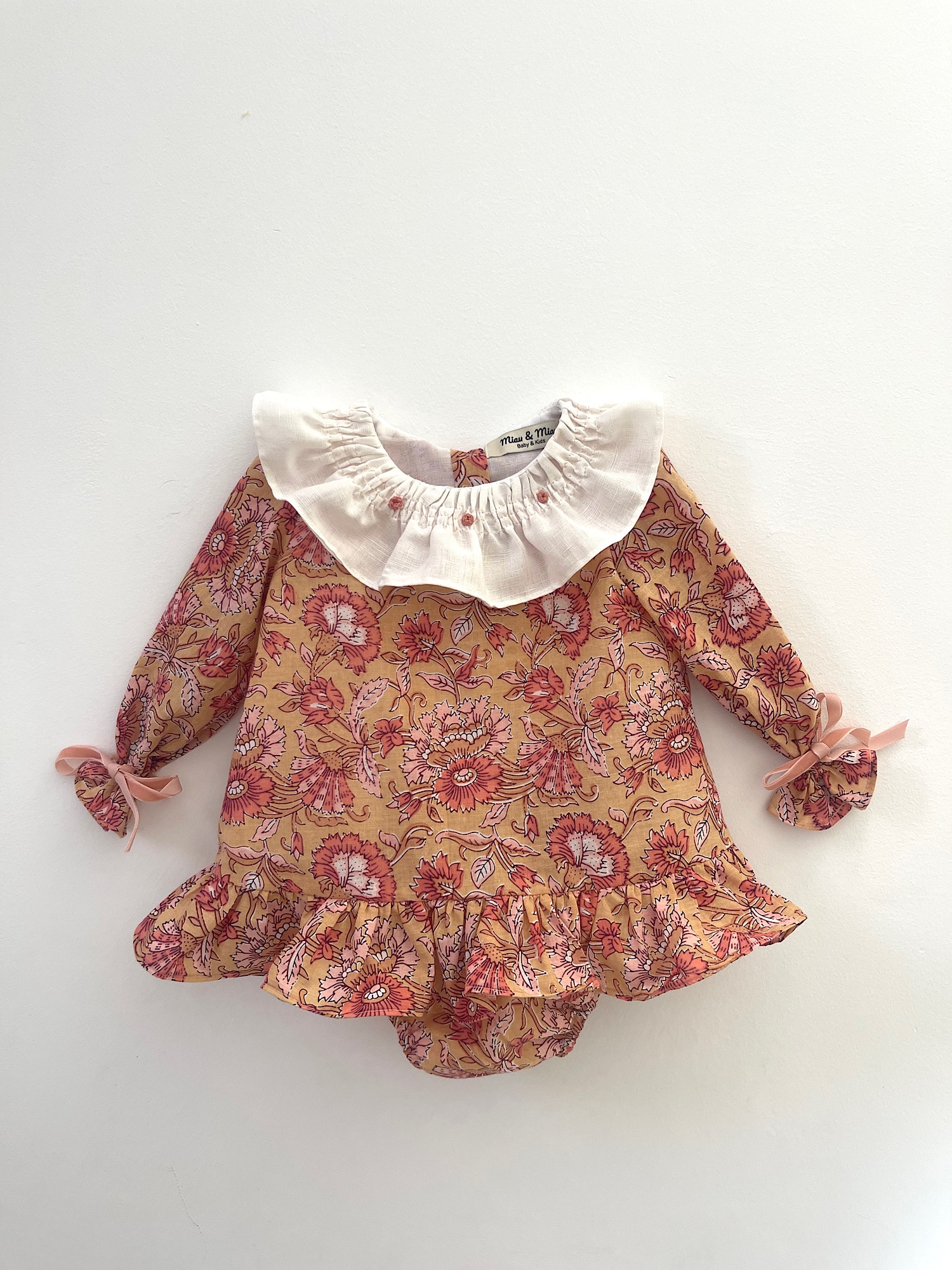 Jesusito con cuello de Lino bordado y tejido Jaipur, abotonado por la espalda y lleva cubre pañal hasta 3 años.