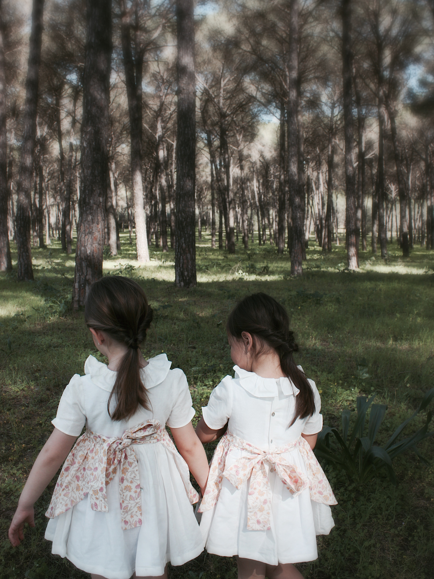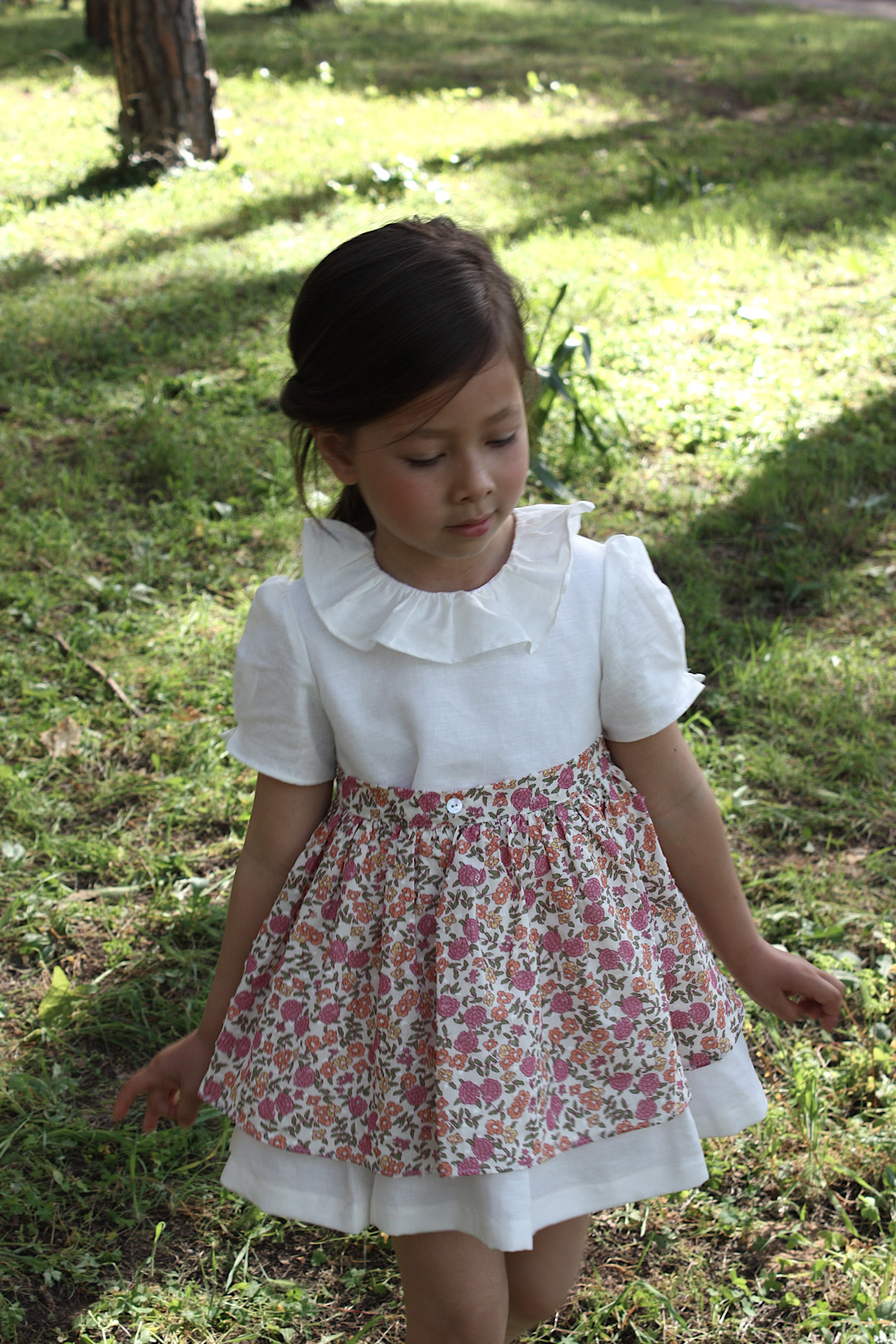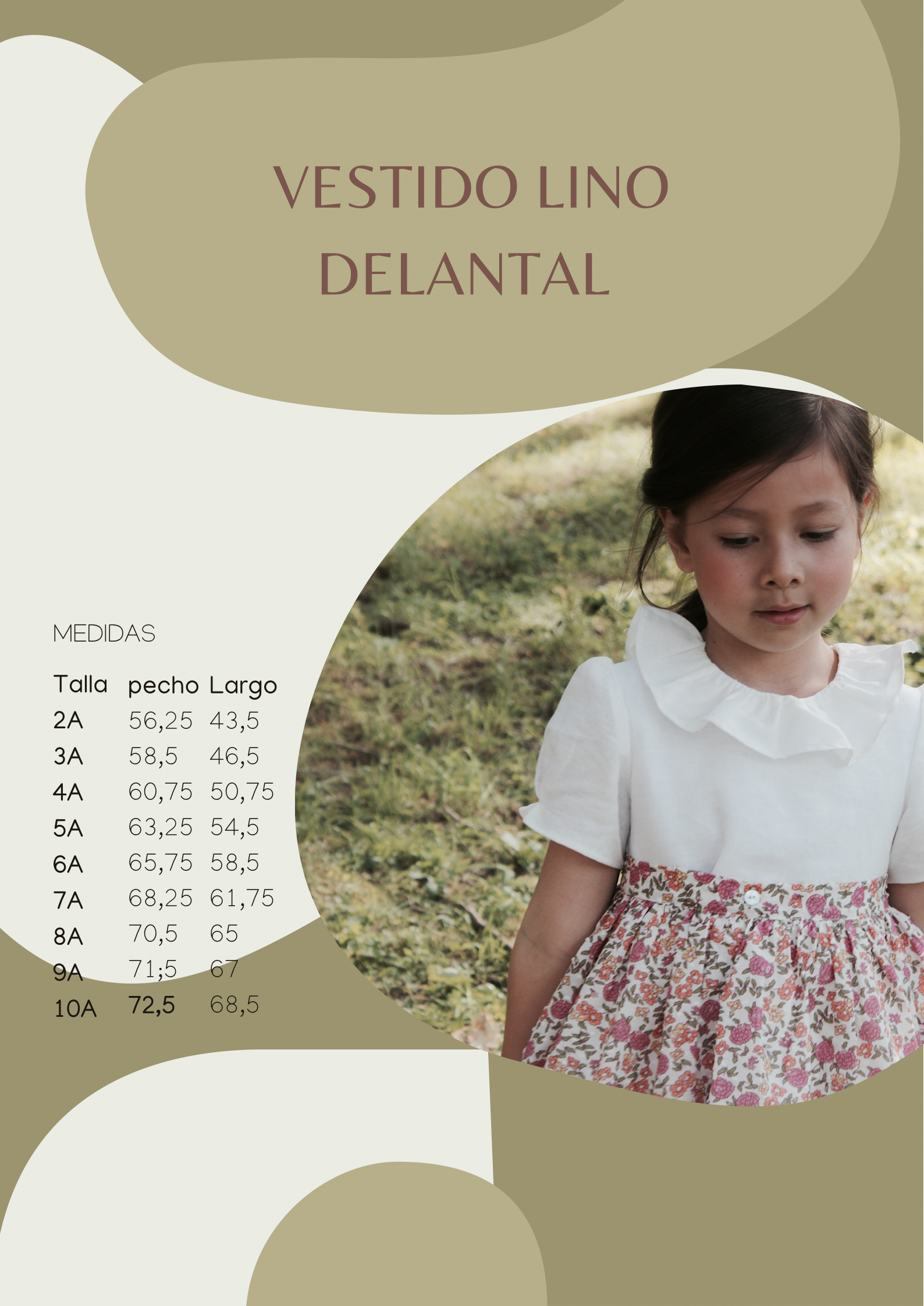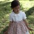 Tejido 100% Lino, va forrado y lleva un delantal con estampado de flores. Por la espalda va abotonado con botones de nácar.