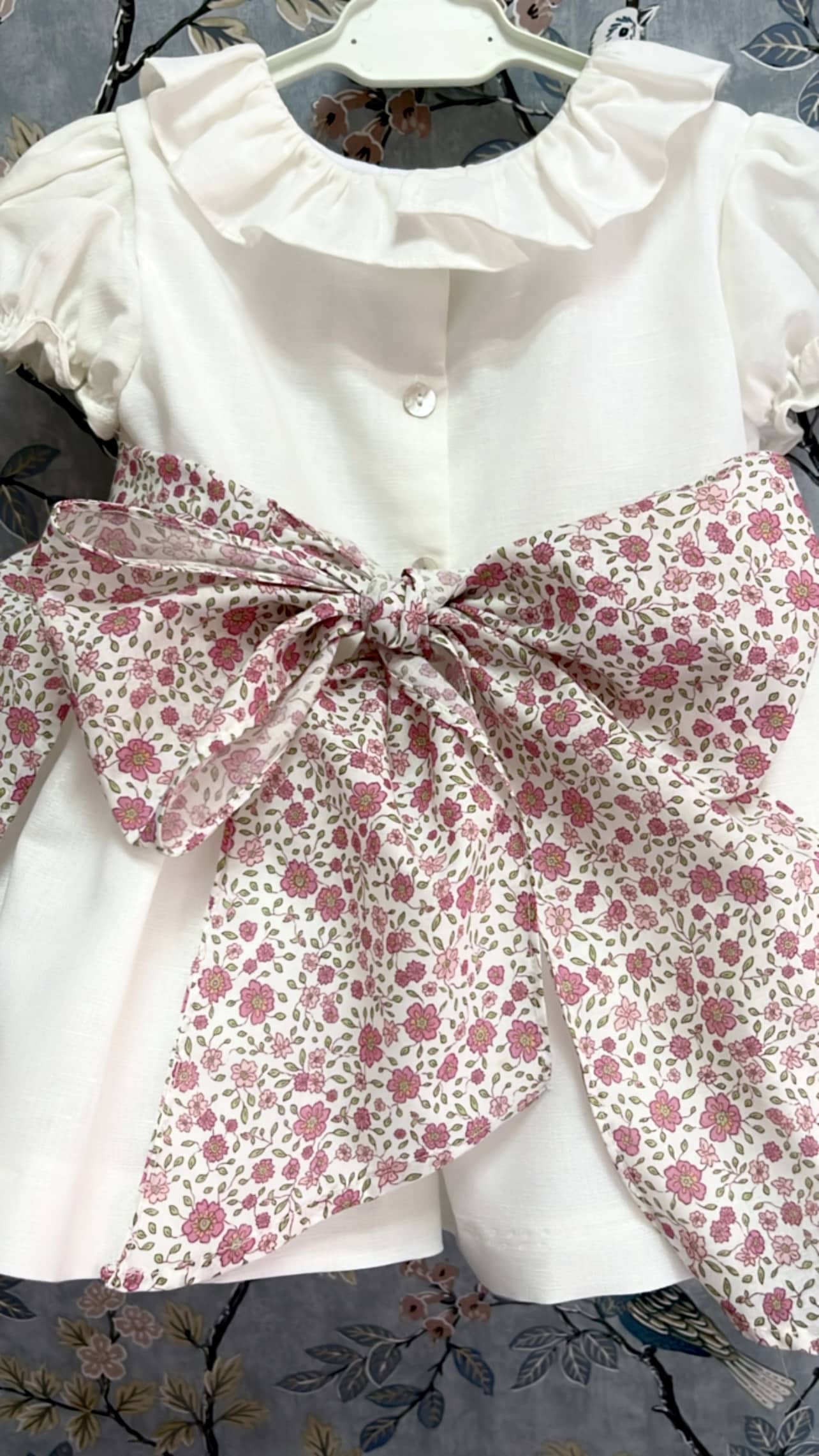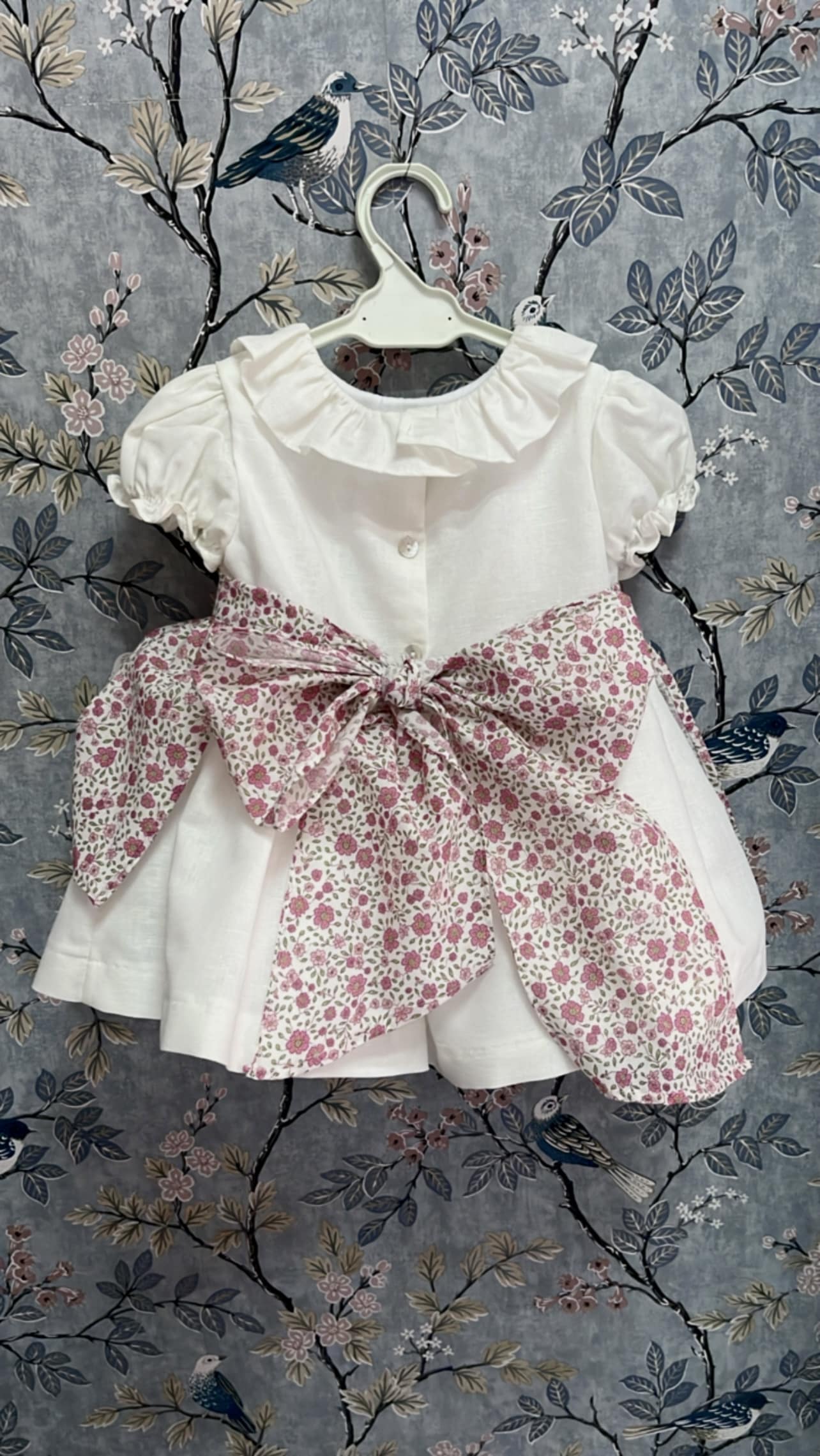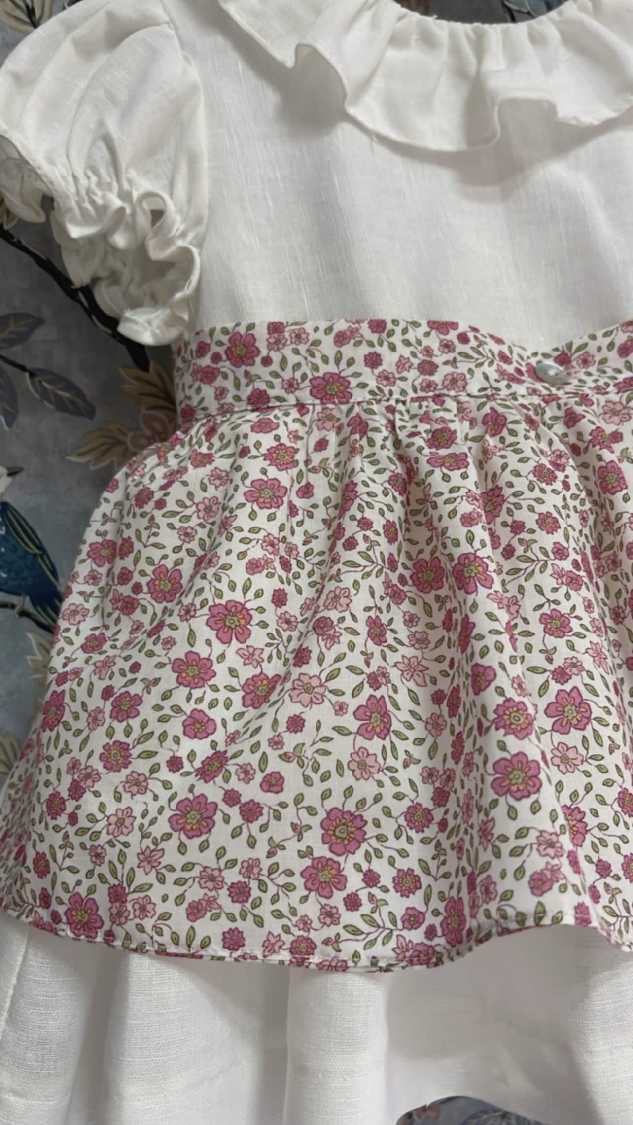 Vestido de Lino forrado con delantal de flores ( se puede poner o quitar), tallan a la edad y hasta 3 años incluye braguitas.