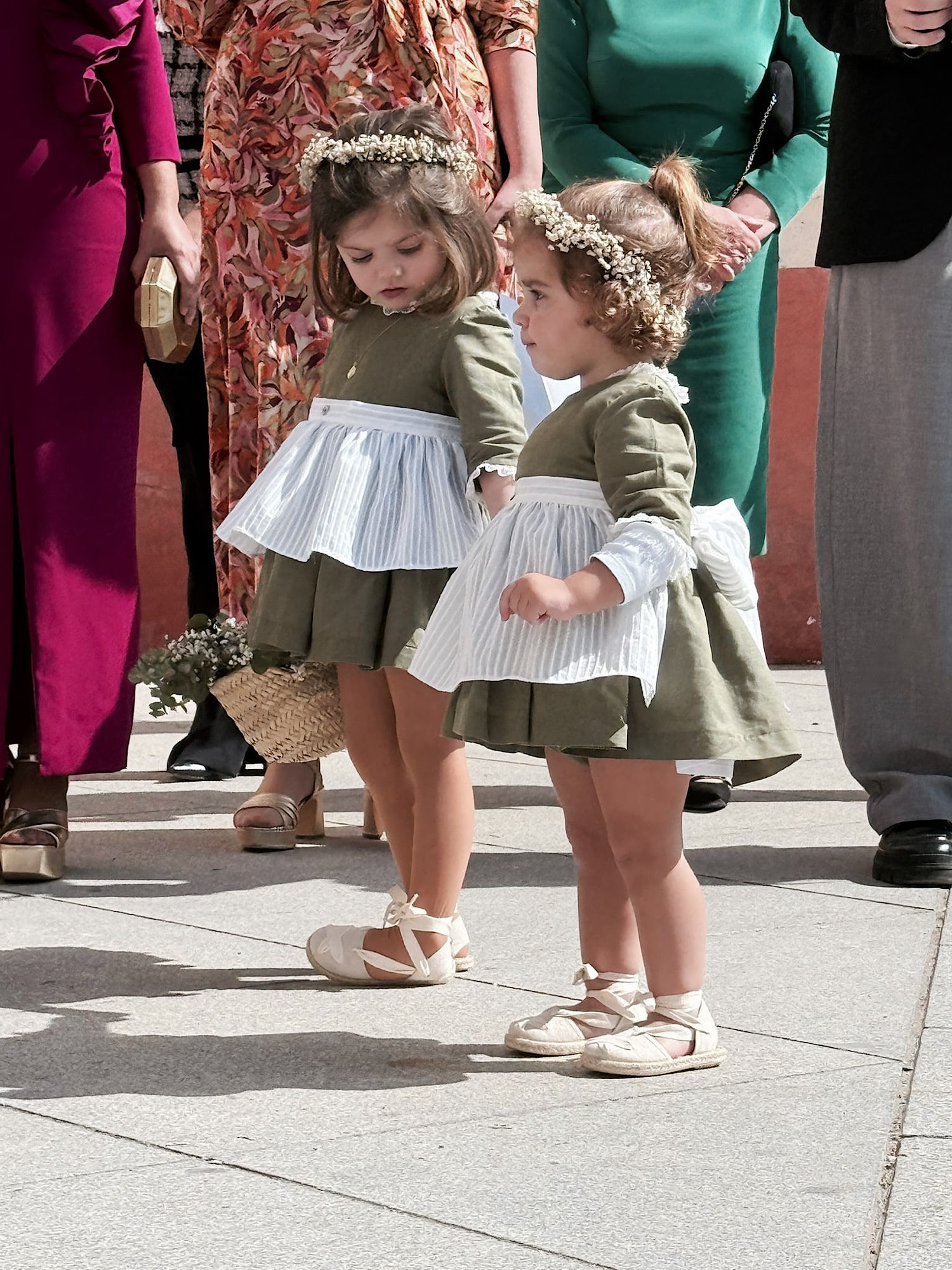 Vestido de Lino en color verde oliva con elegante delantal de rayas, detalle de encajes en media manga y filo del cuello. Totalmente forrado.