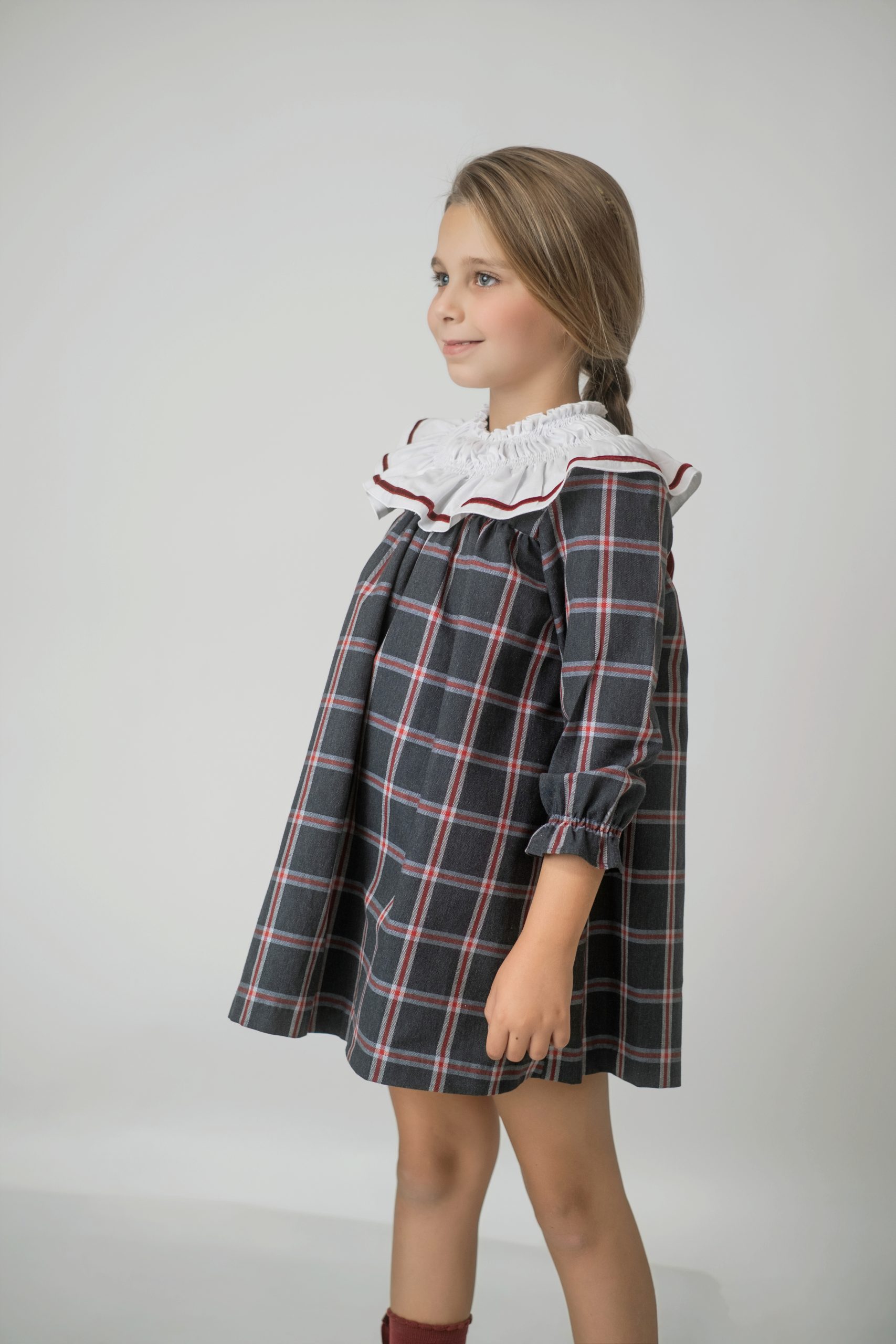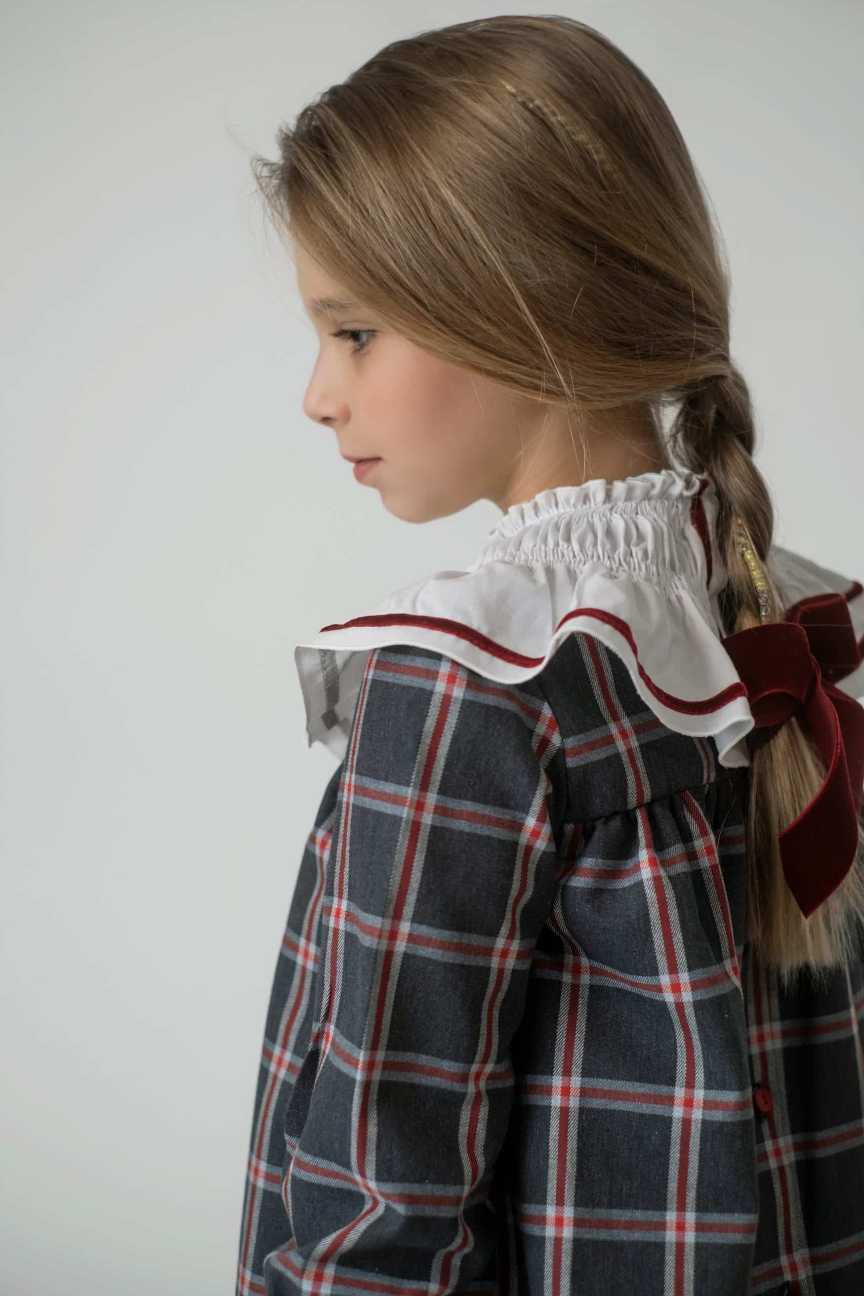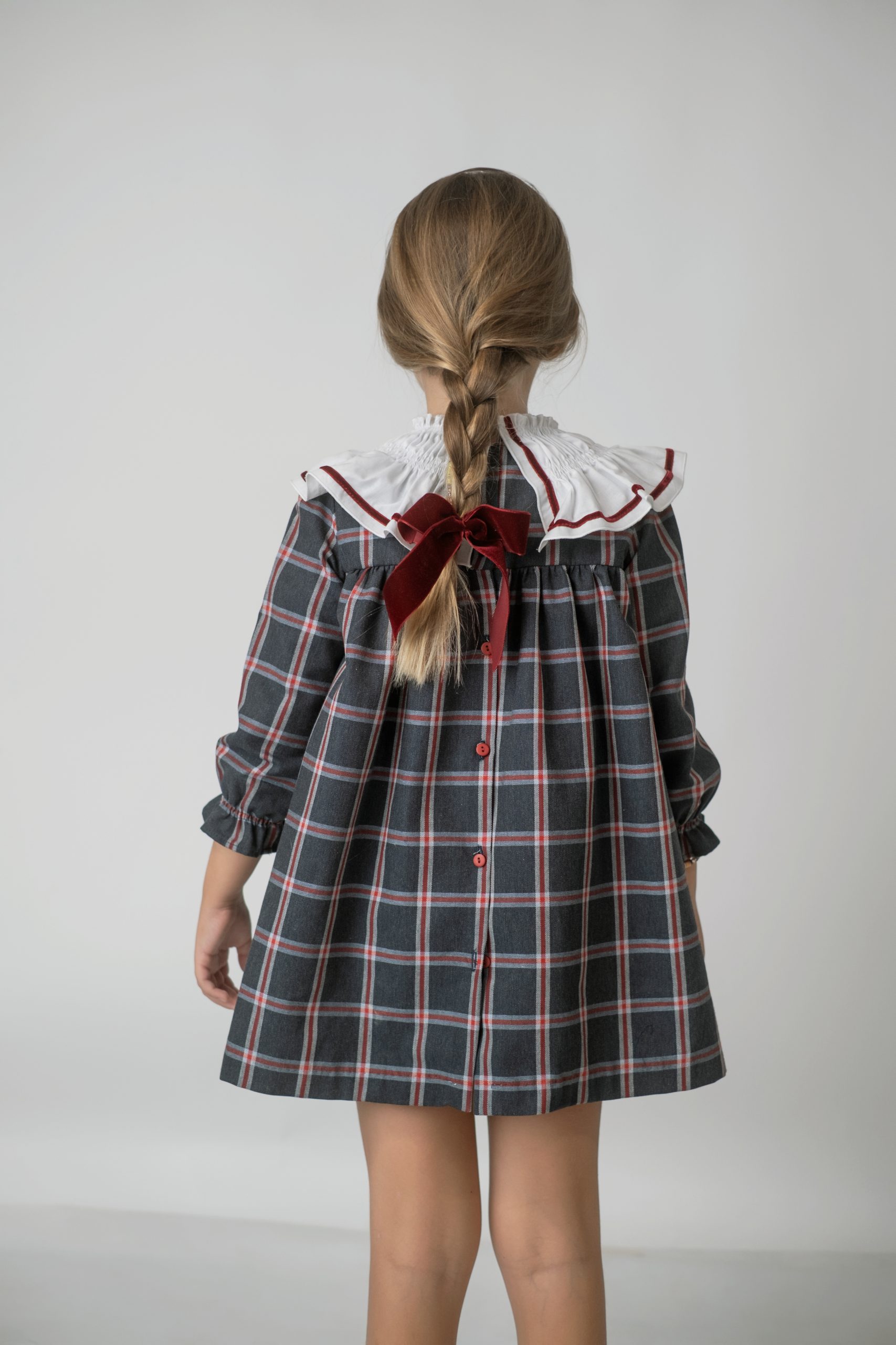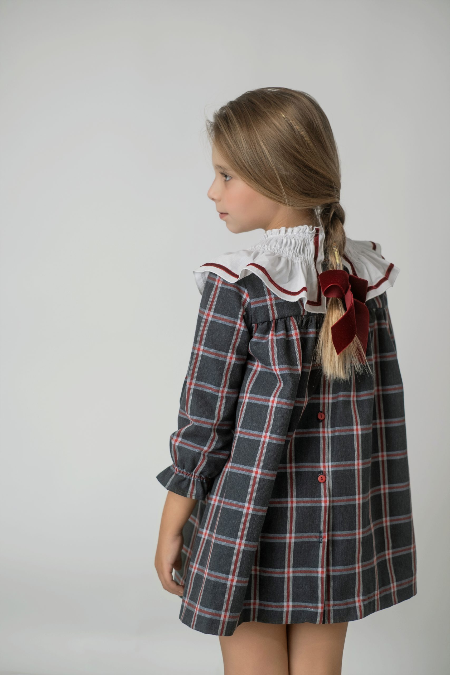 Vestido cuadros Tartán con bonito cuello fruncido y detalle en terciopelo burdeos. No incluye braguitas. Tallan a la edad.